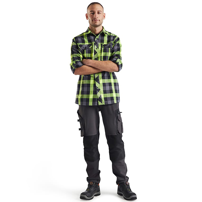 Das weiche und stilvolle Flanellhemd Blakläder mit lockerem Schnitt ist die ideale Wahl für Arbeit und Freizeit. Das klassische Karomuster in Schwarz-Gelb mit reflektierendem Effekt verleiht dem Hemd einen modernen und auffälligen Look. Die angeraute Innenseite sorgt für angenehme Wärme und hohen Tragekomfort über den ganzen Tag. Zwei Brusttaschen mit Klappen, davon die linke mit einer Stiftöffnung, unterstreichen die praktische Funktionalität. Kunststoffknöpfe passen harmonisch zum Design und betonen den lässigen, aber funktionellen Stil. Das Hemd besteht aus 82 % Baumwolle und 18 % Polyester, der einseitig gebürstete Flanell mit einem Gewicht von 180 g/m2 bietet Weichheit, Langlebigkeit und hohen Komfort.