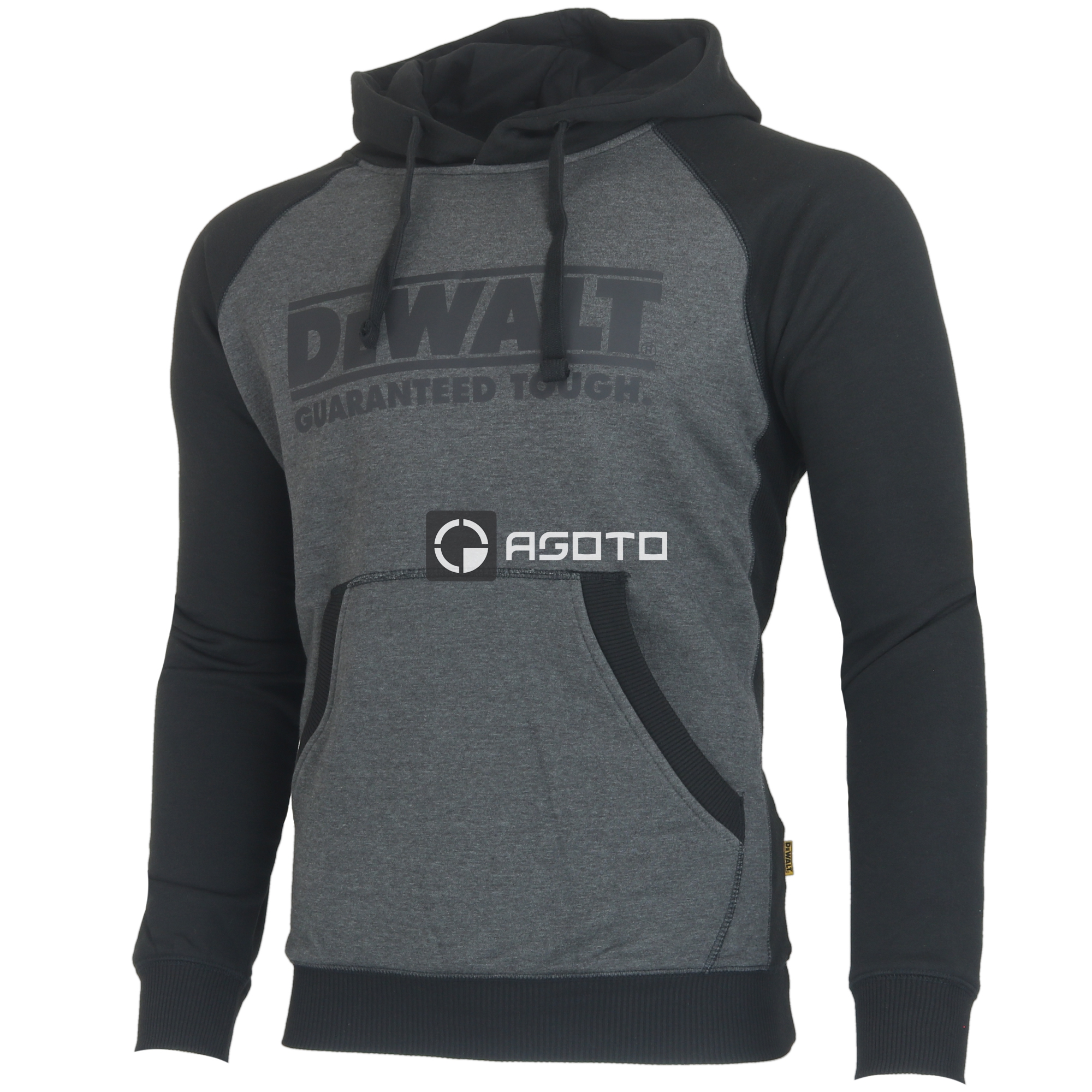Grau melierter Kapuzenpullover. Dreiteilige Kapuzenkonstruktion mit flachem Kordelzug. Kängurutasche vorne. Seitenteile mit Ösen mit Belüftung. Großes DeWalt-Logo auf der Vorderseite. Logo auf dem rechten Arm. Ganzjahres-Sweatshirt, das nicht nur für die Arbeit, sondern auch für den Alltag in der Stadt geeignet ist.