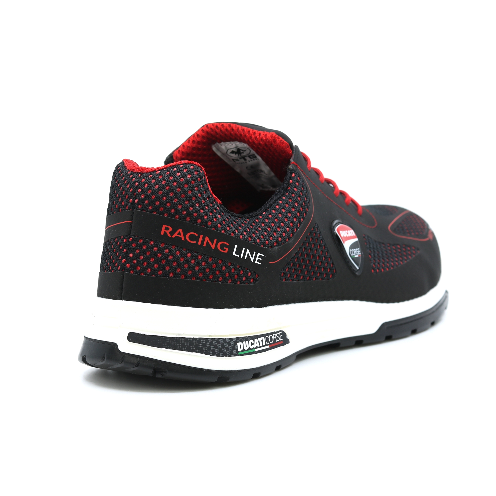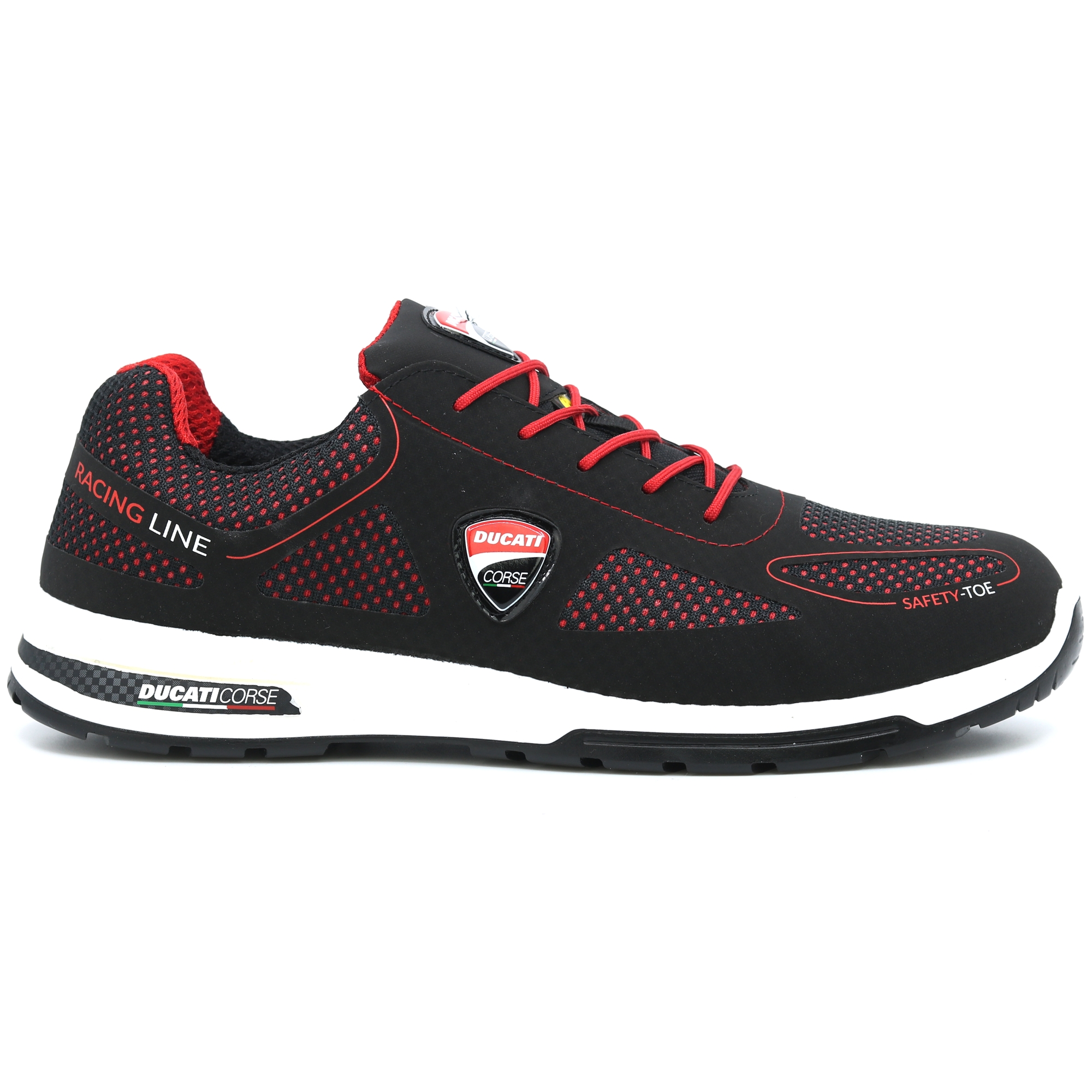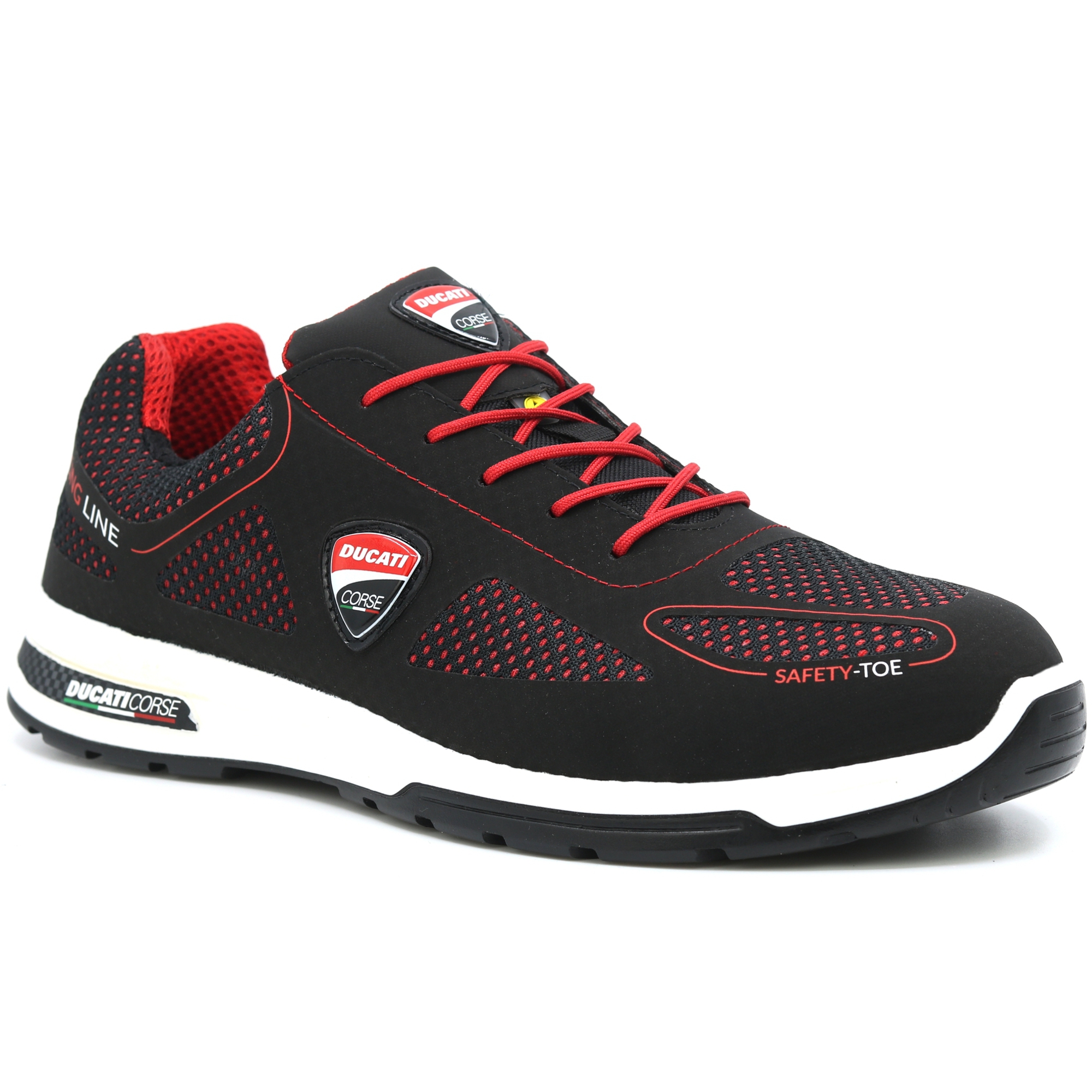 Sicherheitsschuhe Ducati-FTG Estoril S1P SRC, schön anzusehen und angenehm zu tragen; Designstudien, hochwertige Materialien, erfahrene italienische Arbeiter lassen ein außergewöhnliches Produkt für die Arbeitswelt entstehen! Hier sind Estoril als Ganzes: schwarzes Mikrofaser-MESH-Obermaterial mit Polsterung, die Sicherheit und Komfort erhöht, ESD-Schuhe besonders geeignet für den Einsatz in der Mikroelektronikindustrie, Mikrochipmontage und Transitoren; beim Gehen angesammelte Elektrizität wird ständig am Boden abgeleitet und vermeidet den sogenannten "Schock" 100% Polyesterfutter, atmungsaktiv, maschinell bearbeitete Waben, die Schweiß ableiten und den Fuß kühl und trocken halten, Total Metal Free, ganz ohne Verwendung von Metall Komponenten, geeignet für den Einsatz in Umgebungen mit Metalldetektoren, ESD Sport-Lite Einlegesohle, atmungsaktiv, aus Schaumstoff mit hoher Dichte an offenen Zellen. SPORT-Sohle aus Double-Density-Polyurethan, flexibel, mit hoher Abrieb-, Wasser- und Ölbeständigkeit. Einlegesohle aus nichtmetallischer HRP-Folie mit hochzähen, wachsbeschichteten Plasmaschichten. THIN CAP schlagfest bis 200 J, leicht, nicht magnetisch und athermisch. EN ISO 20345 - SICHERHEITSSCHUHE