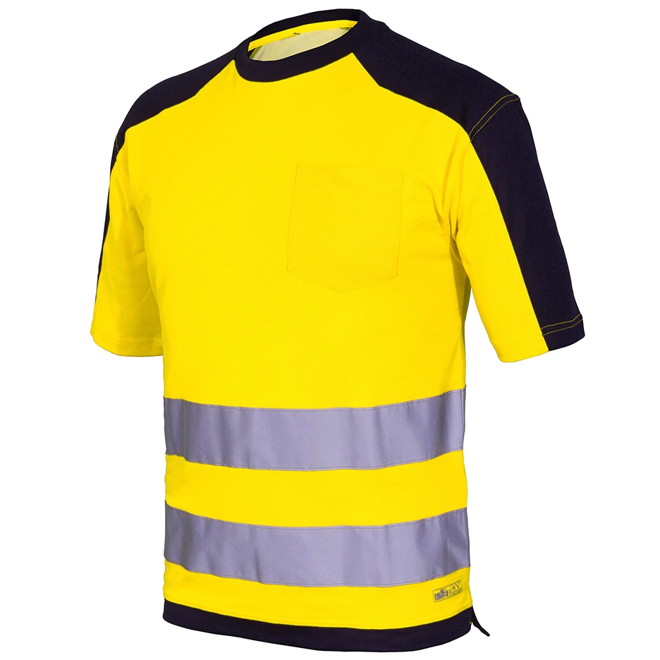 Výstražné tričko s kulatým průkrčníkem, krátký rukáv, reflexní pruhy: 2 horizontální (šíře 5 cm). Doporučené použití: stavebnictví, silničáři, řidiči, logistika, údržba, kolo, motorky, skladování. Výstražná kolekce italské značky ISSA je navržena tak, aby vyhověla nejnáročnějším požadavkům kladeným na pracovní oblečení. Konstrukce střihu je zaměřena na technické detaily, které oceníte nejen při práci. Oděv je vyroben: 50% bavlna, 50% polyester, 165 g/m2.