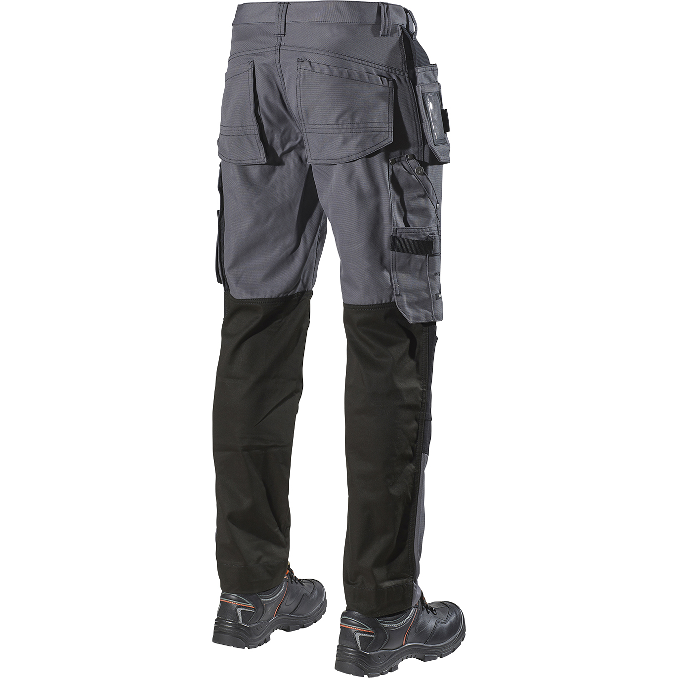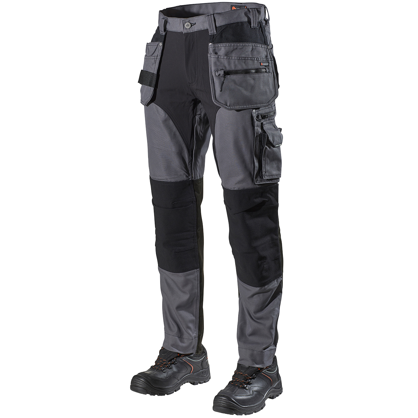 Elastisches Material an Vorderseite, vorderen Knien und über die gesamte Wade für hervorragende Beweglichkeit, Komfort und Atmungsaktivität. Vorgeformte Knie für eine bessere Passform und Flexibilität. Verstärkte Kniepad-Taschen aus Stretch-Kevlar bieten gute Beweglichkeit und Strapazierfähigkeit. Leicht zulaufende Beine der Hose, um besser an ihrem Platz zu bleiben. Der Saum der Hosenbeine kann um 5 cm verlängert werden. Präziser Schnitt, Silhouette und Bund sorgen dafür, dass die Hosen auch während langer Schichten an Ort und Stelle bleiben. Verstärkte Hängetaschen mit größerem Volumen. Belüftung an der Innenseite des Oberschenkels, mit Reißverschluss verstellbar, innen mit einem Netzmaterial gefüttert, das den Träger kühl hält. Die linke Beintasche mit korrekt geneigter Handytasche mit magnetischem Verschluss hält das Telefon geschützt und an seinem Platz. Taschen und Halterungen: Zwei Hängetaschen, vier Vordertaschen, zwei Gesäßtaschen. Kniepad-Tasche in zwei Höhen, Zollstocktasche, Beintasche mit Reißverschluss und Handytasche innen und außen sowie ein Ausweiskartenhalter an der rechten Hängetasche. Material und Gewicht: 65% Polyester, 35% Baumwolle. 325 g/m2.