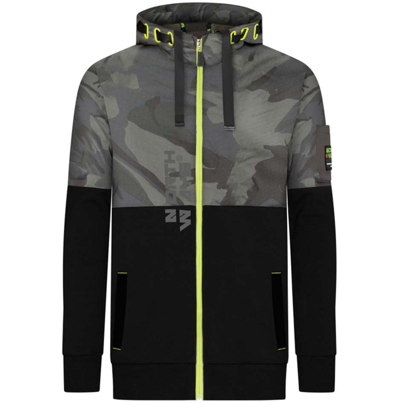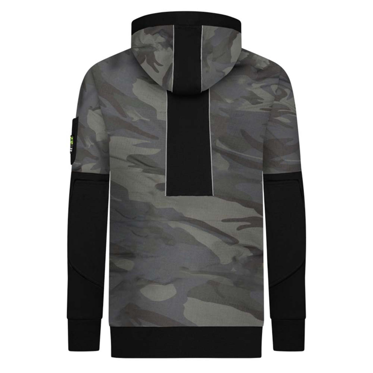 Moderner Camouflage-Hoodie/Jacke mit vielen Taschen für Kleinigkeiten. Ellbogenverstärkungen, verstellbare Kapuze, Kinnschutz. 7 Taschen: 2 Reißverschlusstaschen, 3 aufgenähte Taschen, 2 Innentaschen. 70 % Baumwolle 30 % Polyester