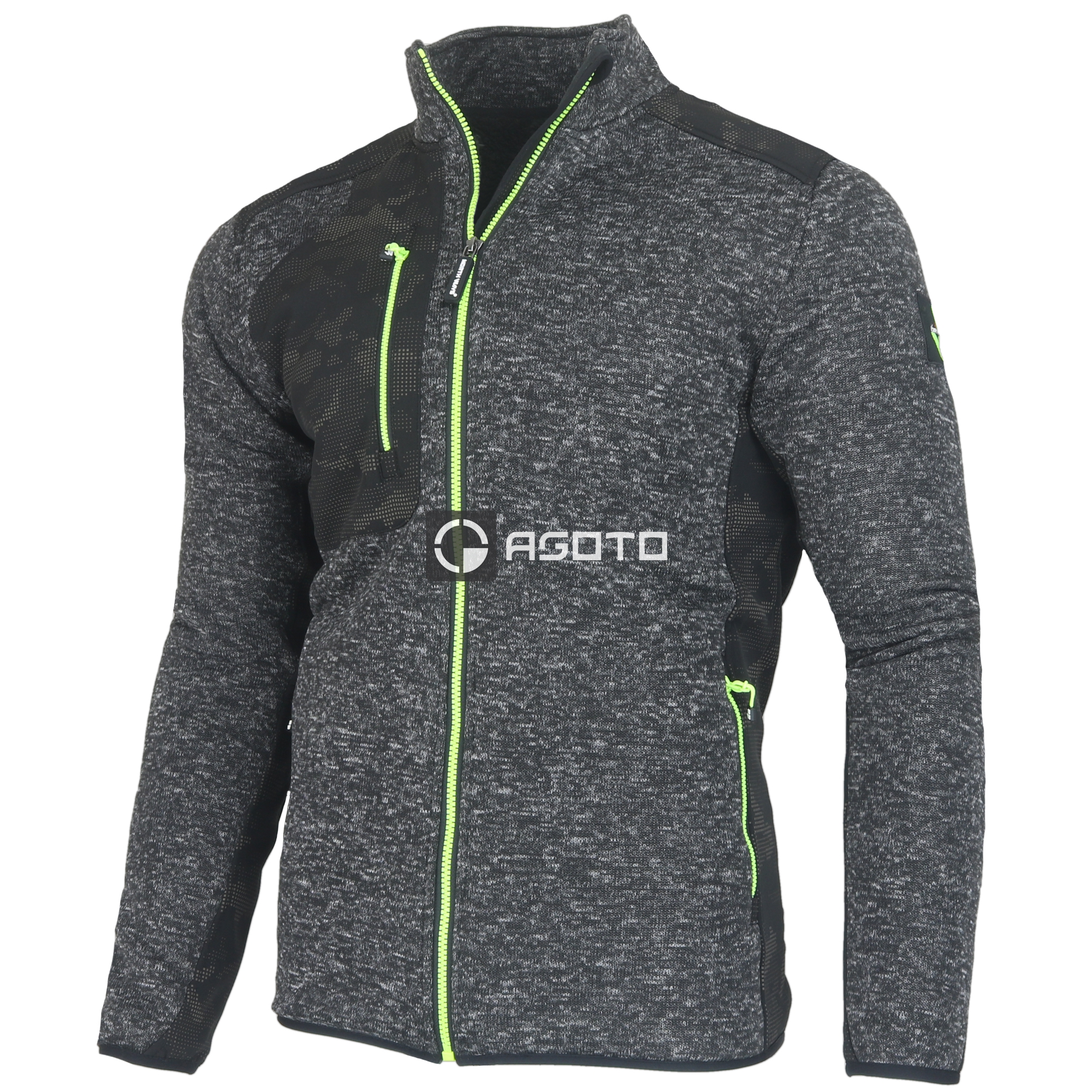 Moderne Strickjacke für Herren mit reflektierenden Elementen für bessere Sichtbarkeit Verstärkte Schultern, Seiten und Taschen. Hoher Kragen, Kinnschutz, elastische Diagonalabschlüsse. 5 Taschen: 3 Reißverschlusstaschen, 2 Innentaschen. 100 % Polyester gestrickt, 300 g/m2