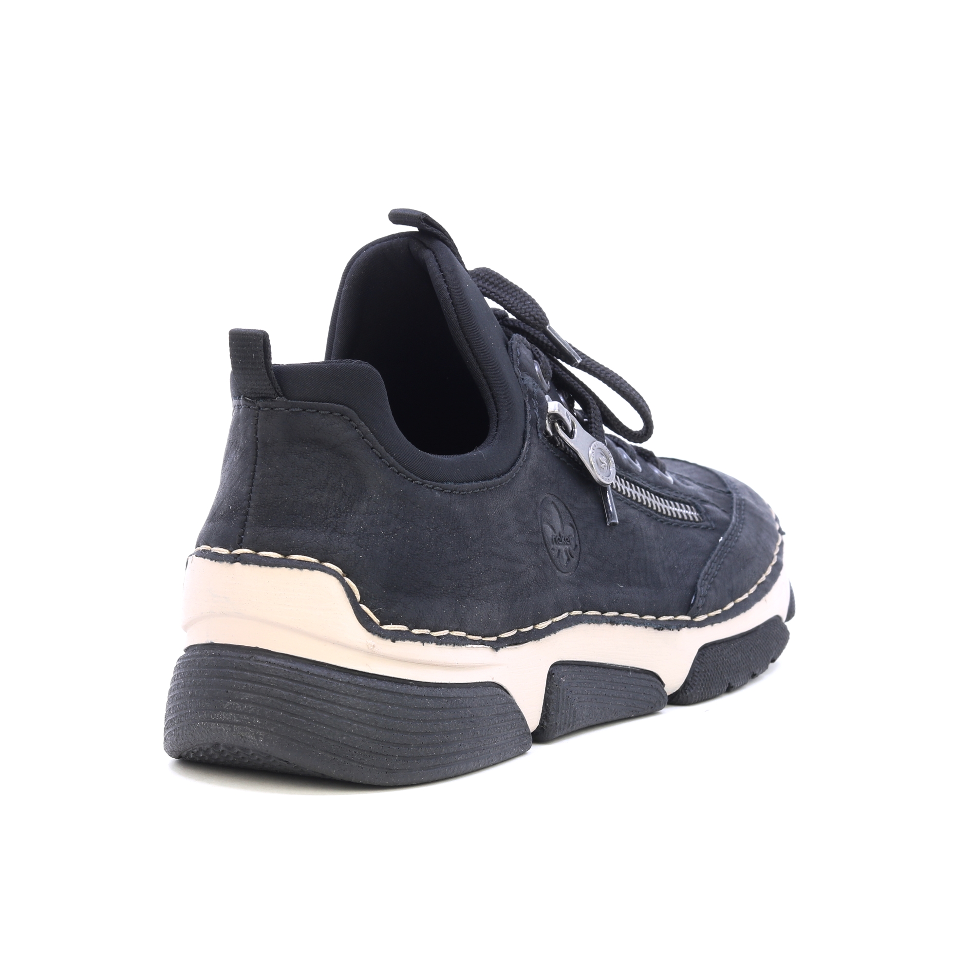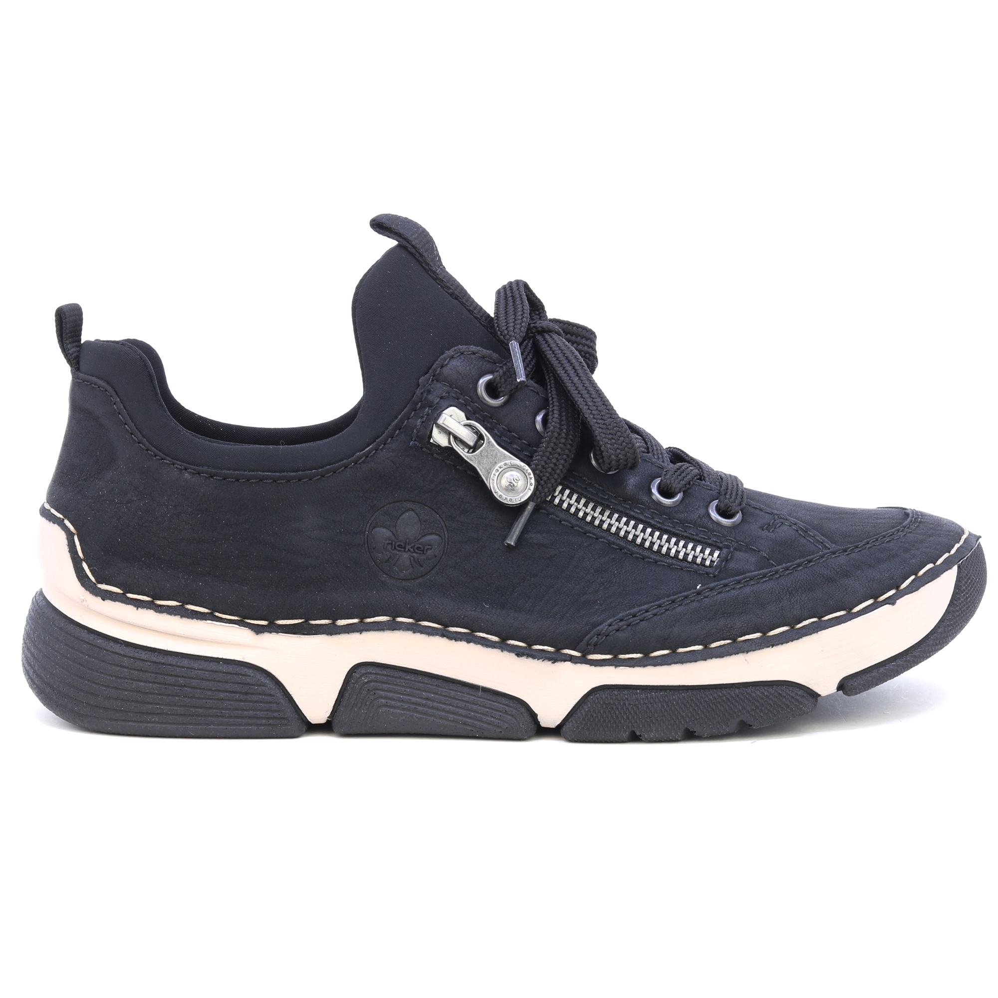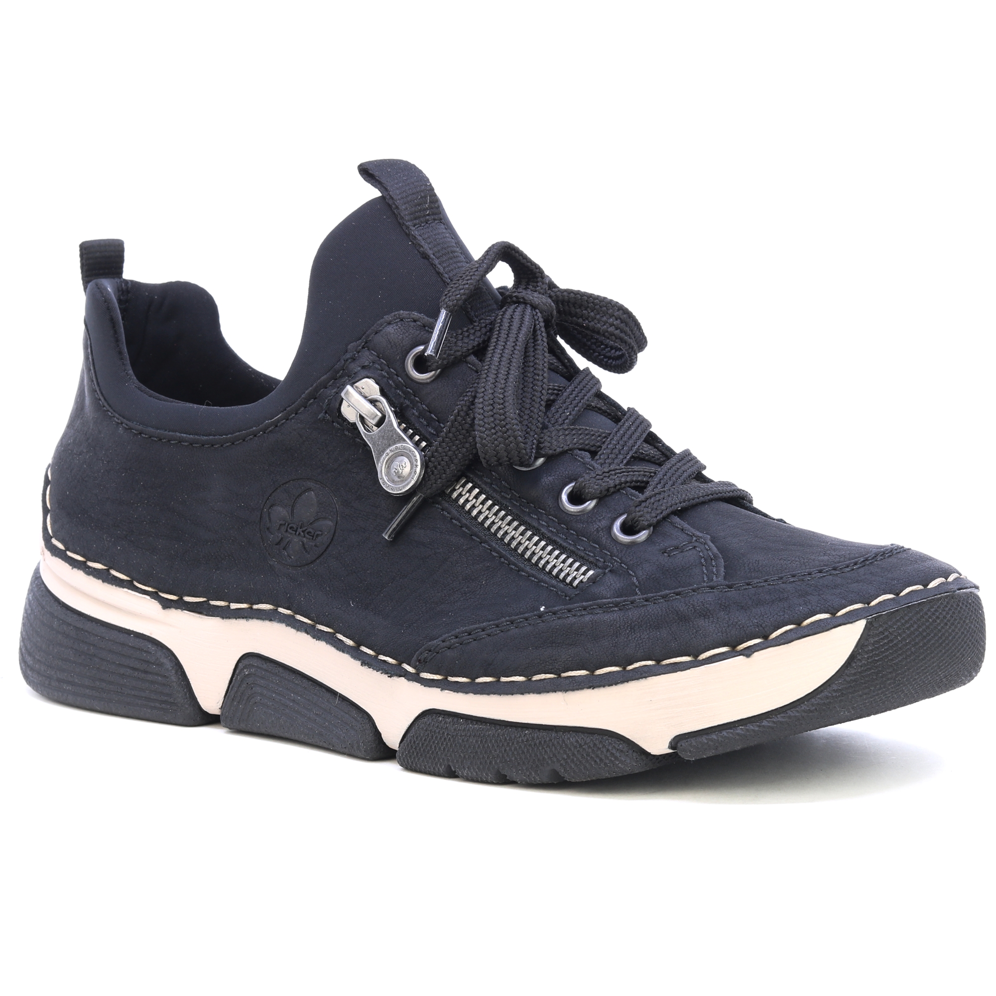 Schwarze Sneaker von RIEKER mit dekorativem Reißverschluss und eingraviertem Logo bieten eine Kombination aus Stil und Funktionalität. Das schwarze Obermaterial steht im Kontrast zur modernen Sohle, die dank Stoßdämpfungstechnologie für maximalen Komfort beim Gehen sorgt. Die Innensohle aus Leder sorgt für ein angenehmes Fußgefühl, während die Schnürung und der elastische Saum am oberen Rand einen einfachen Einstieg und eine perfekte Passform ermöglichen. Diese Sneaker sind die ideale Wahl für den Alltag und bieten den ganzen Tag über zuverlässigen Halt und Komfort. Technologie: Antistress: Diese Technologie garantiert Leichtigkeit, Flexibilität, Geräumigkeit und hervorragende Stoßdämpfung und trägt so zu einem komfortableren Gehen bei.