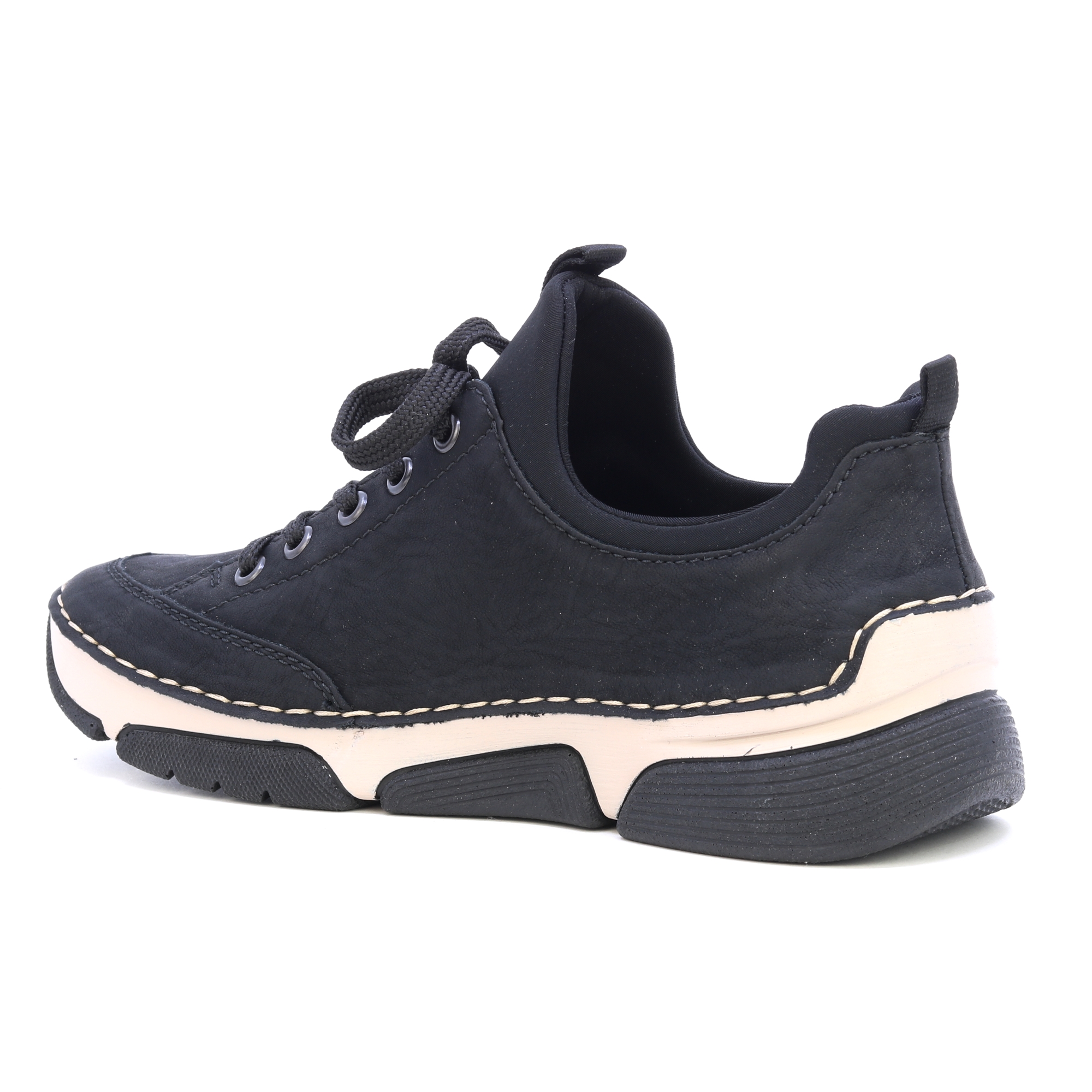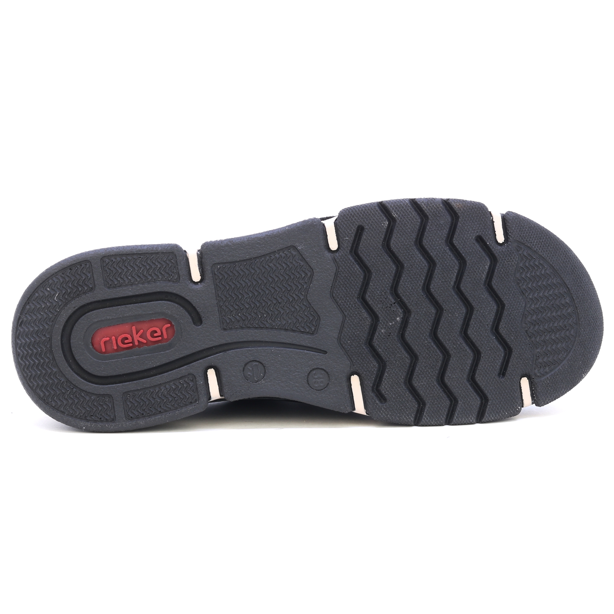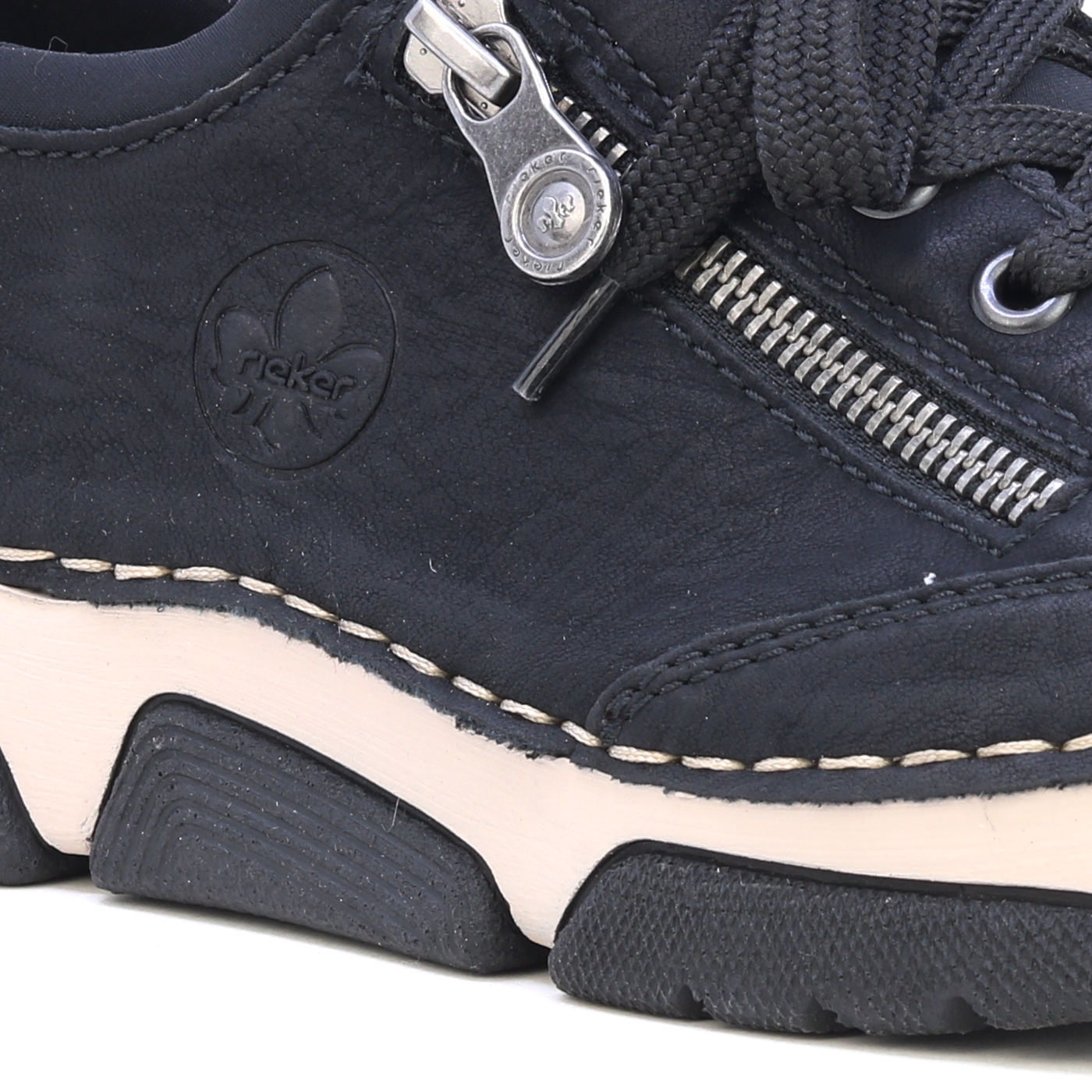 Schwarze Sneaker von RIEKER mit dekorativem Reißverschluss und eingraviertem Logo bieten eine Kombination aus Stil und Funktionalität. Das schwarze Obermaterial steht im Kontrast zur modernen Sohle, die dank Stoßdämpfungstechnologie für maximalen Komfort beim Gehen sorgt. Die Innensohle aus Leder sorgt für ein angenehmes Fußgefühl, während die Schnürung und der elastische Saum am oberen Rand einen einfachen Einstieg und eine perfekte Passform ermöglichen. Diese Sneaker sind die ideale Wahl für den Alltag und bieten den ganzen Tag über zuverlässigen Halt und Komfort. Technologie: Antistress: Diese Technologie garantiert Leichtigkeit, Flexibilität, Geräumigkeit und hervorragende Stoßdämpfung und trägt so zu einem komfortableren Gehen bei.