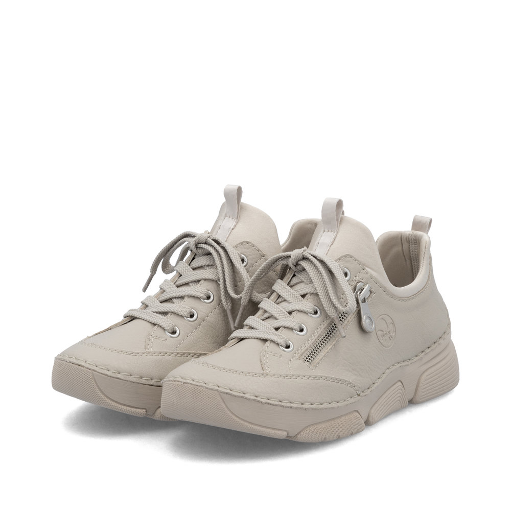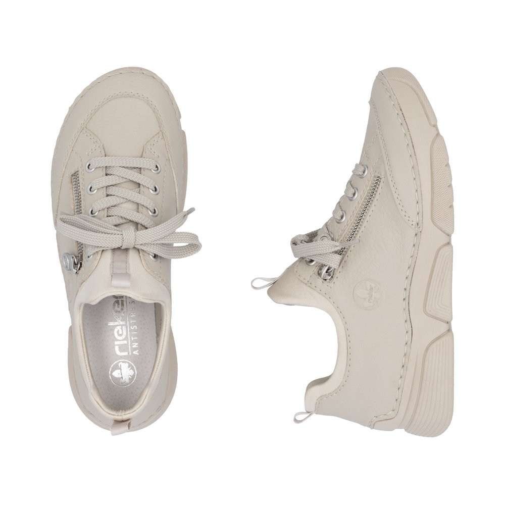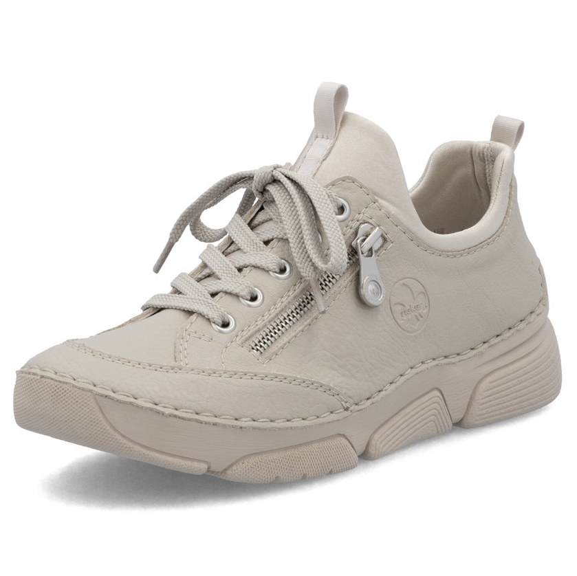 Diese RIEKER Sneaker vereinen Originalität, Stil und Komfort auf ideale Weise. Das beigefarbene Design in Kombination mit dem geprägten Markenlogo und dem dekorativen Reißverschluss verleiht dem Schuh einen einzigartigen, modernen Charakter. Der flexible obere Schuhrand ermöglicht ein schnelles und bequemes Anziehen, während die Schnürung hauptsächlich als stilvolles Designelement dient. Die weiche Ledereinlegesohle sorgt für ganztägigen Tragekomfort – ob im Alltag, bei der Arbeit oder beim entspannten Spaziergang. Dank ihres universellen Looks lassen sich diese Sneaker leicht mit verschiedenen Outfits kombinieren und werden schnell zu einem Lieblingsstück in Ihrem Kleiderschrank. Die Antistress-Technologie von RIEKER sorgt durch Stoßdämpfung, Leichtigkeit, Flexibilität und Geräumigkeit für ein noch angenehmeres Lauferlebnis.