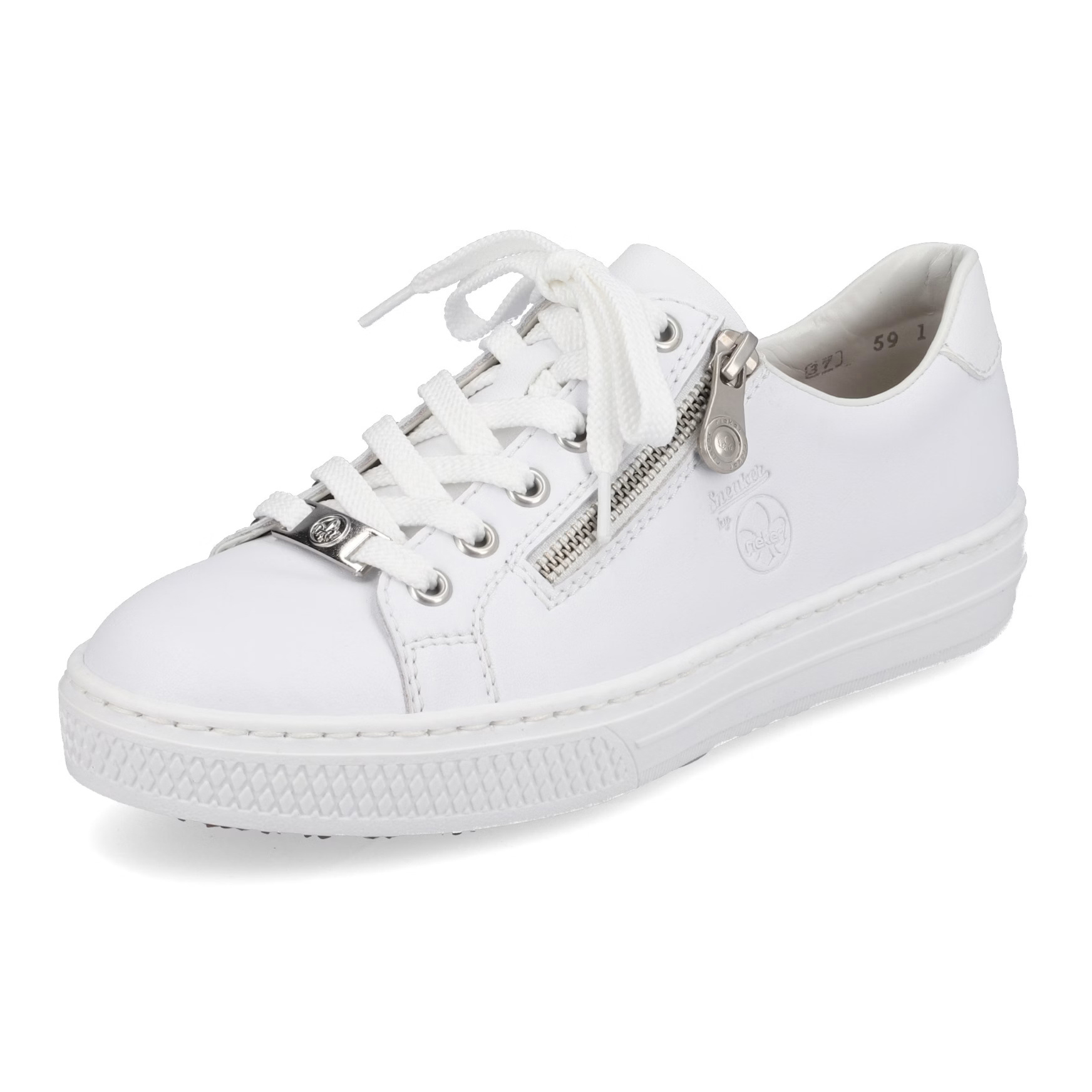 Die Damen-Sneaker RIEKER L59L1-83 in elegantem Weiß sind eine ideale Wahl für Frauen, die ein stilvolles und bequemes Accessoire für den Alltag suchen. Diese Sneaker bestehen aus hochwertigen Materialien, die Leichtigkeit, Atmungsaktivität und ganztägigen Komfort gewährleisten. Die weiche Innensohle und die flexible Sohle garantieren bequemes Gehen und optimale Fußunterstützung. Das moderne Design mit klaren Linien und feinen Details verleiht dem Schuh einen universellen Look, der sowohl zu lässigen Outfits als auch zum urbanen Stil passt. Die praktische Schnürung ermöglicht eine einfache Anpassung an die Fußform, während das dezente Markenlogo seine Qualität und seinen Stil unterstreicht. Die RIEKER L59L1-83 Sneakers sind die perfekte Wahl für Komfort und Eleganz im Alltag.
