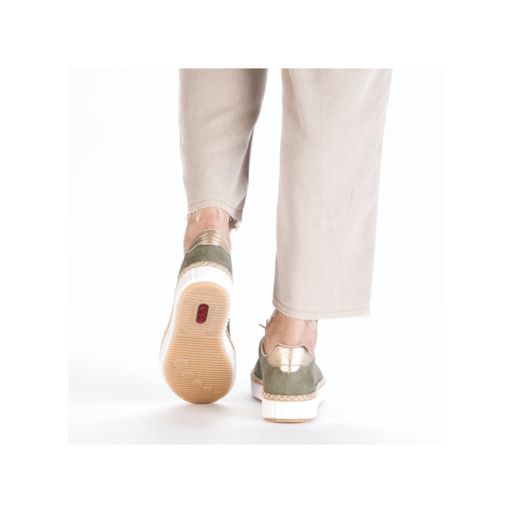 Stylische und bequeme grüne Damensneaker RIEKER M2940-52 sind die perfekte Wahl für den Alltag. Die leichte Konstruktion, die flexible Sohle und die weiche Innensohle sorgen für maximalen Komfort, auch bei ganztägiger Bewegung. Das elegante, minimalistische Design ermöglicht eine einfache Kombination mit verschiedenen Outfits, von leger bis sportlich. Die Sneaker sind aus robusten und pflegeleichten Materialien gefertigt, während die rutschfeste Sohle Sicherheit auf verschiedenen Oberflächen bietet. Der ideale Begleiter für Spaziergänge, Einkäufe oder Reisen – mit dem Modell RIEKER M2940-52 sehen Sie stilvoll aus und fühlen sich den ganzen Tag über bequem.