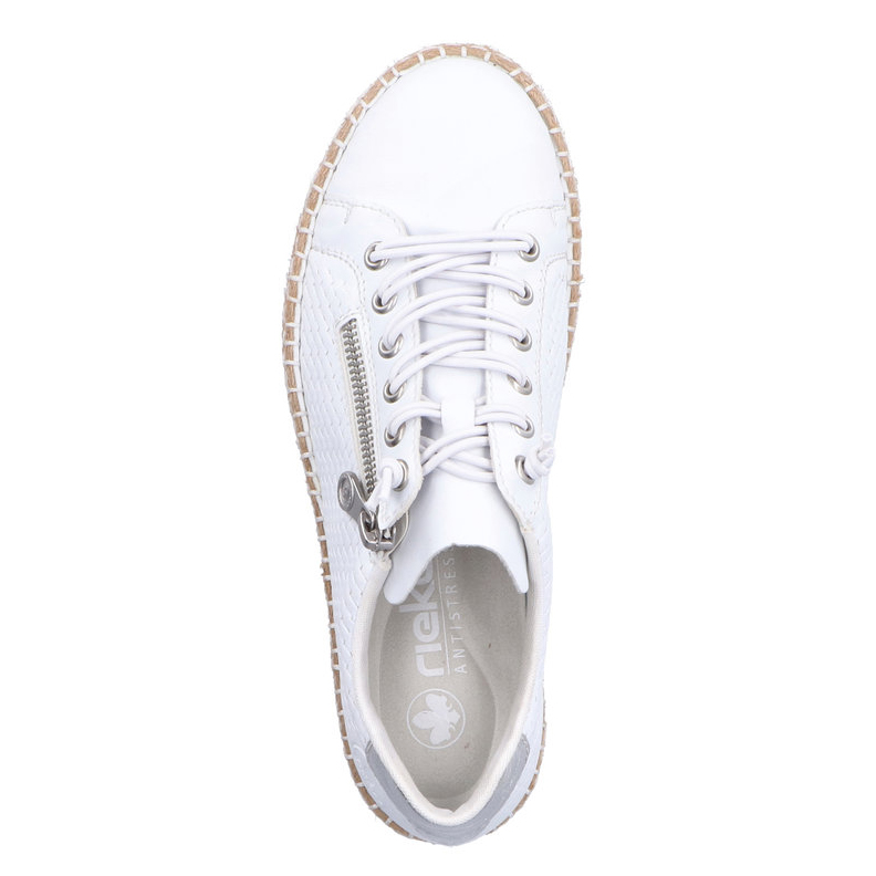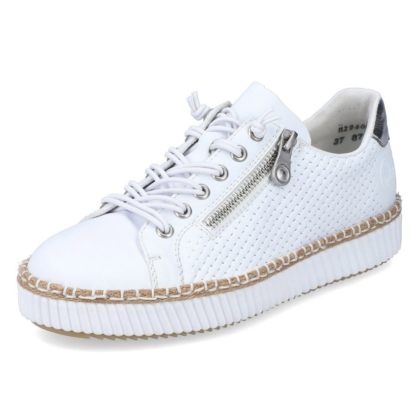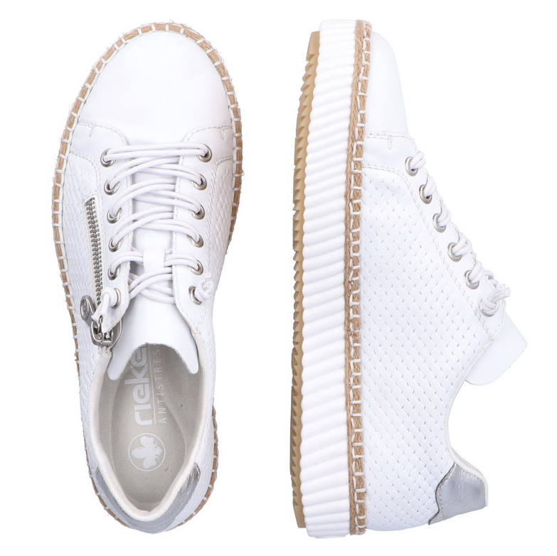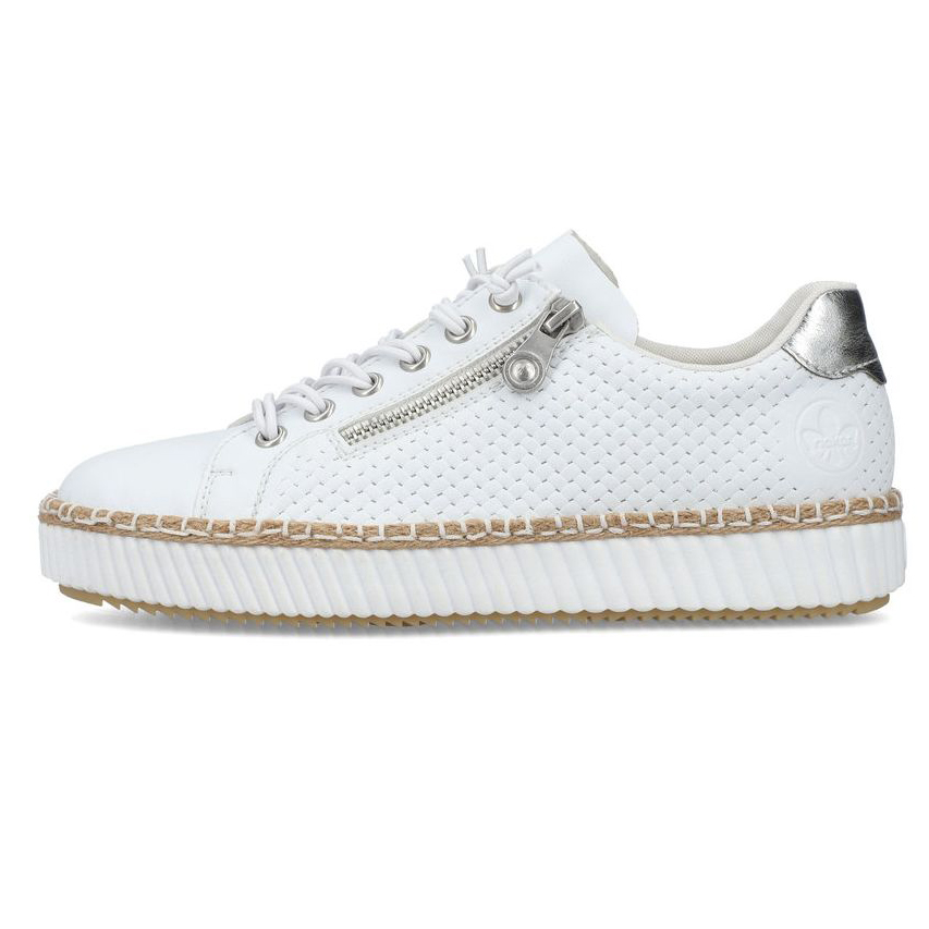 Die stilvollen und bequemen weißen Damen-Sneaker RIEKER M2940-80 sind die perfekte Wahl für den Alltag. Die leichte Konstruktion, die flexible Sohle und die weiche Innensohle sorgen für maximalen Komfort auch bei ganztägiger Bewegung. Das elegante minimalistische Design ermöglicht eine einfache Kombination mit verschiedenen Outfits, von lässig bis sportlich. Die Sneaker bestehen aus strapazierfähigen und pflegeleichten Materialien, während die rutschfeste Sohle für Sicherheit auf den unterschiedlichsten Untergründen sorgt. Der RIEKER M2940-80 ist der ideale Begleiter für Spaziergänge, Einkäufe oder Reisen und sorgt dafür, dass Sie den ganzen Tag über stilvoll und bequem aussehen.