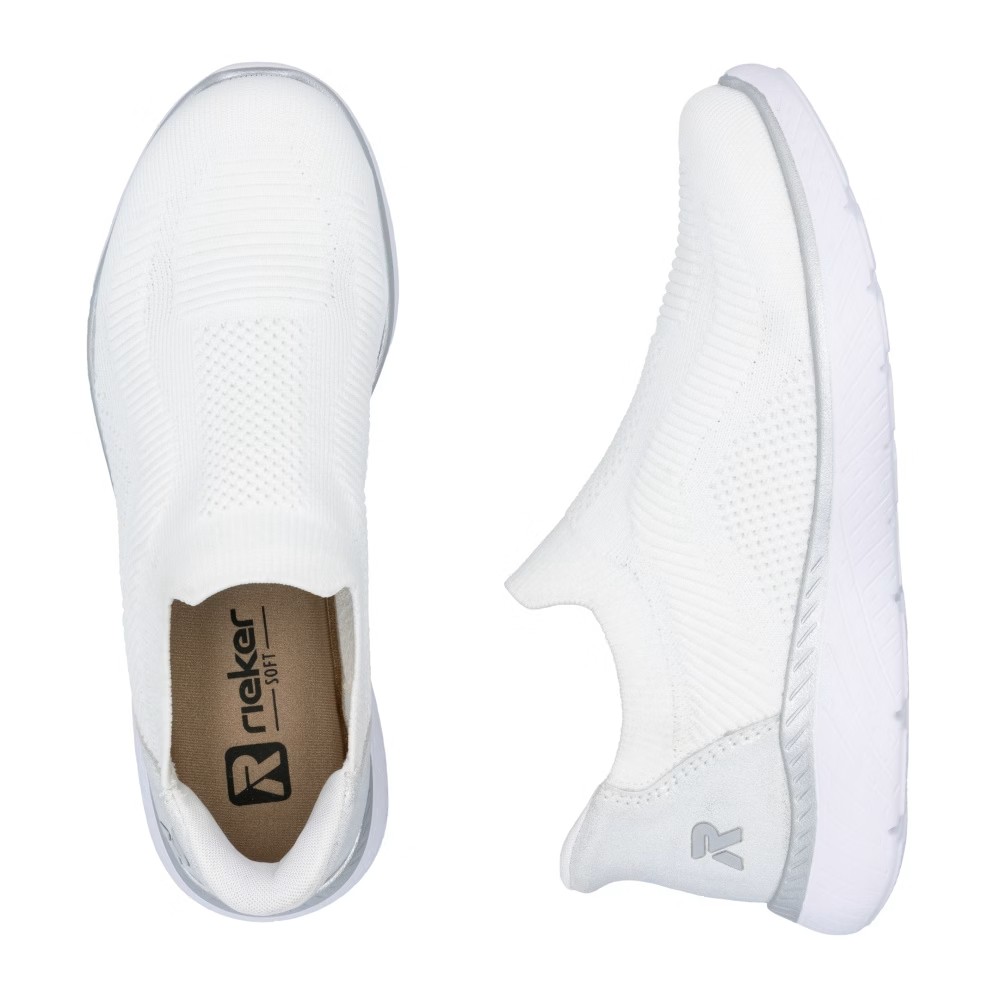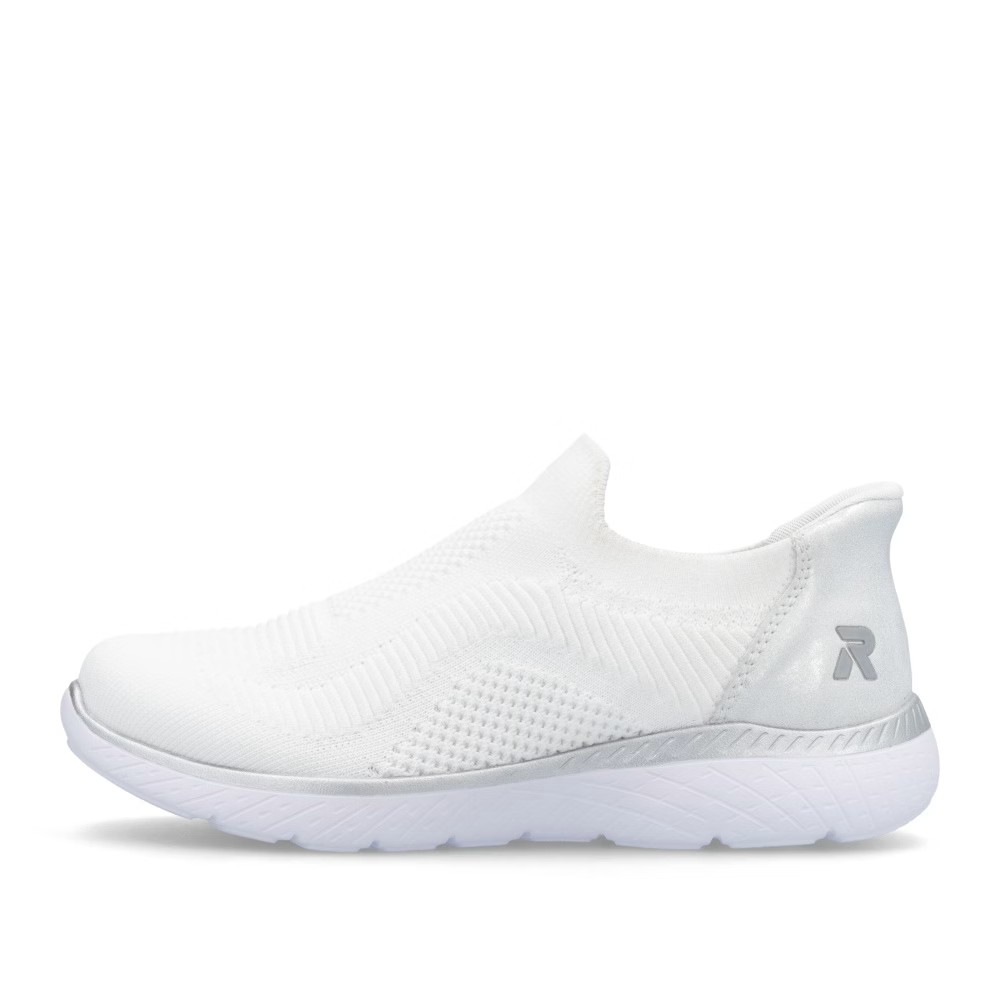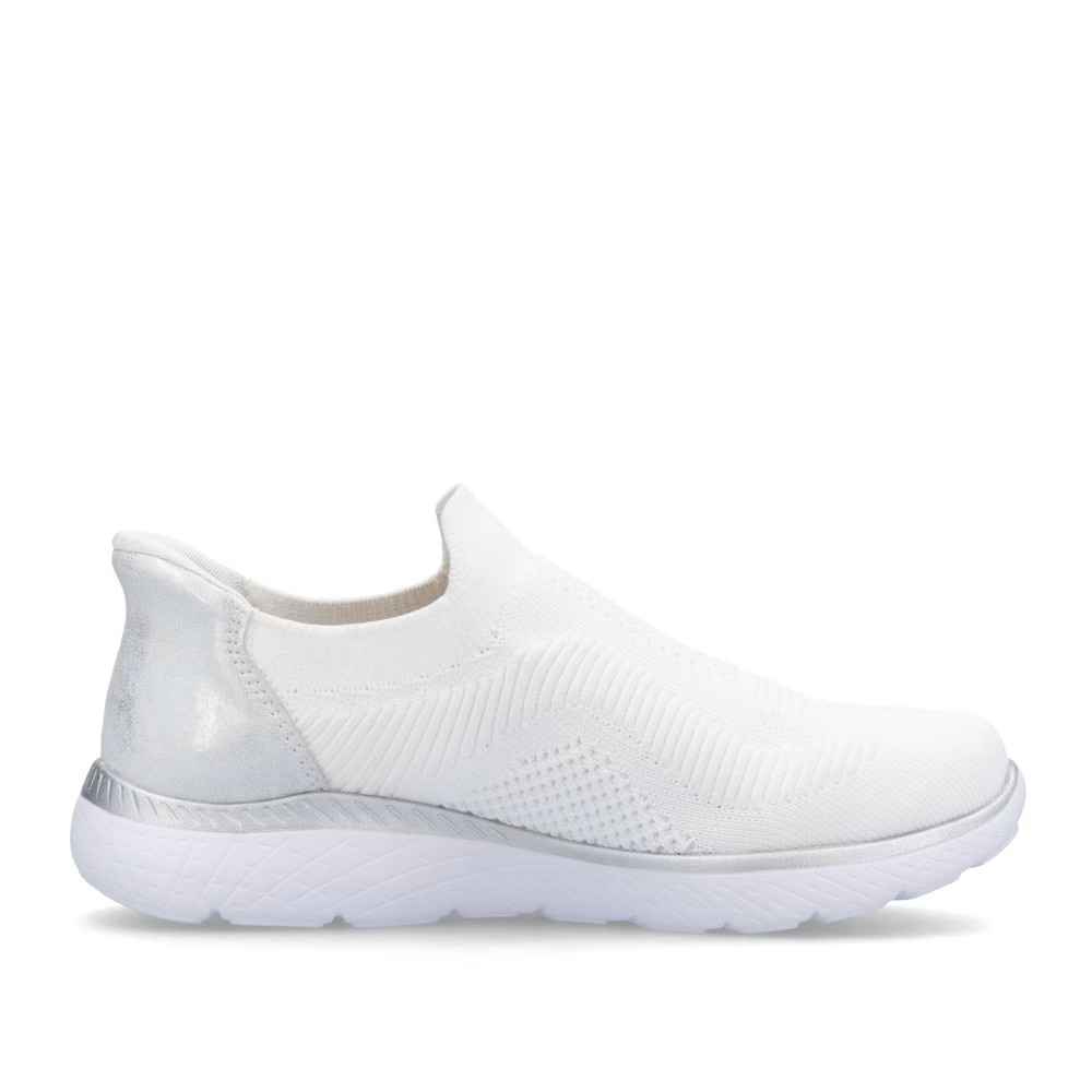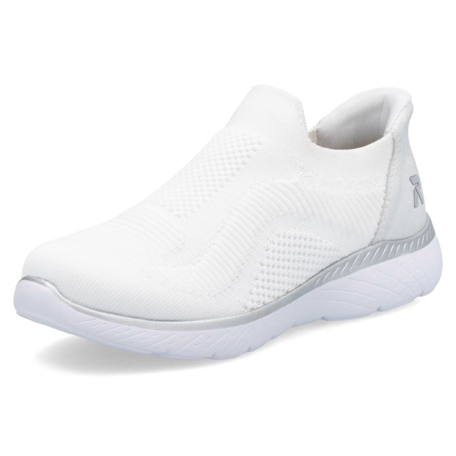 Die RIEKER Sneakers, die Sie mühelos anziehen und mit Leichtigkeit in den Tag starten, bieten nicht nur hohen Tragekomfort, sondern auch einen eleganten Stil dank der Kombination aus Weiß und Silber, die jedes Outfit aufhellt. Das textile Obermaterial sorgt für eine einfache Anpassung an die Fußform und ermöglicht ein schnelles Anziehen. Die weiche Memory-Foam-Einlegesohle passt sich perfekt an den Fuß an und bietet maximalen Komfort bei jedem Schritt. Die stoßdämpfende Sohle ist mit einem glänzenden Streifen verziert, der den Sneakern einen modernen Look verleiht und ihr einzigartiges Design unterstreicht. Eine ideale Wahl für den Alltag – sowohl für die Arbeit als auch für die Freizeit, wo modisches Design auf höchsten Tragekomfort trifft.