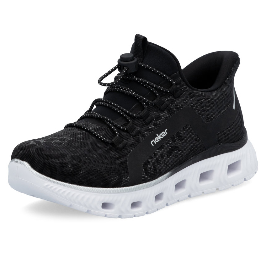 Dieses Modell von RIEKER kombiniert modernes Design mit maximalem Komfort und ist somit die ideale Wahl für den Alltag. Das schwarze Obermaterial mit elegantem Muster wird durch einen flexiblen Schaftabschluss und eine elastische Schnürung ergänzt, die für eine optimale Passform und einfaches Anziehen sorgen. Die leichte und flexible Sohle bietet hervorragende Dämpfung und unterstützt die natürliche Bewegung des Fußes – perfekt für ganztägiges Tragen. Die einzigartige MemoSoft-Einlegesohle aus Memory-Schaum passt sich perfekt an die Fußform an und sorgt für ein weiches Auftreten mit maximalem Komfort. Dank der Antistress-Technologie sind die Schuhe außergewöhnlich leicht, flexibel und bieten ausreichend Platz für die natürliche Bewegung der Füße, während das Ready2GO-System ein einfaches Anziehen ohne Hände ermöglicht. Dieses Modell ist ideal für alle, die stilvolles, aber dennoch funktionales und bequemes Schuhwerk für den täglichen Gebrauch suchen.