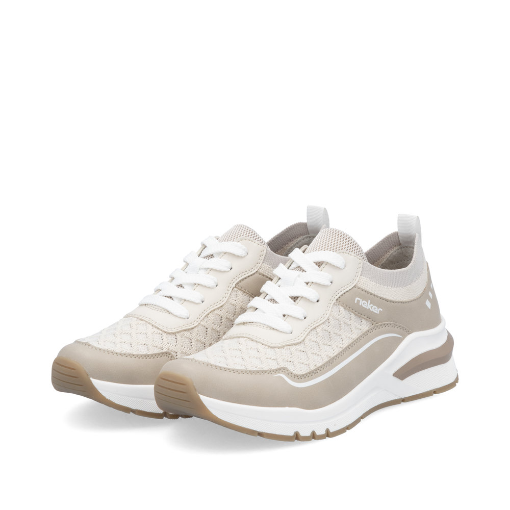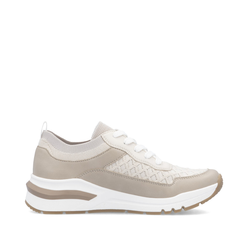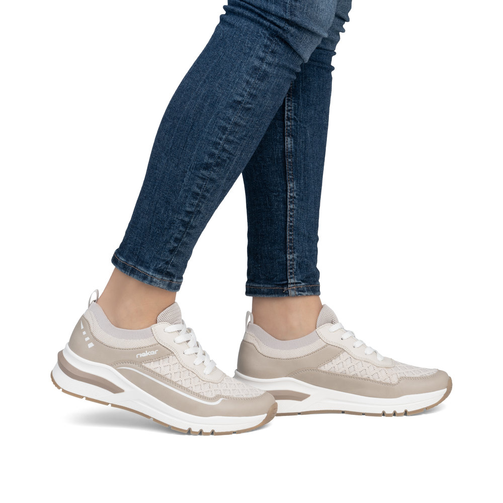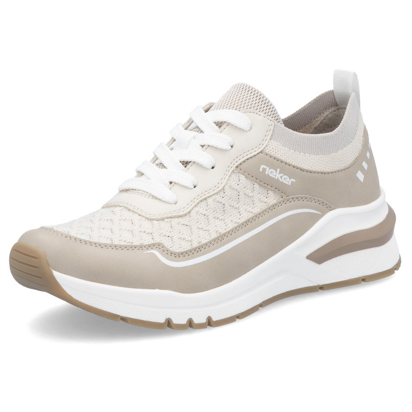 Die Damen-Sneaker RIEKER M6609-60 in elegantem Beige sind die perfekte Wahl für den Alltag, da sie Komfort und Stil vereinen. Leichte Materialien und das atmungsaktive Obermaterial sorgen für ein angenehmes Tragegefühl, auch bei längerem Tragen. Dank der praktischen Schnürung passt sich der Schuh optimal an die Fußform an, während die weiche Memory-Foam-Einlegesohle für eine hervorragende Dämpfung bei jedem Schritt sorgt. Das moderne Design wird durch die leichte Sohle ergänzt, die nicht nur optisch überzeugt, sondern auch Stöße effektiv absorbiert und die natürliche Bewegung des Fußes unterstützt. Diese Sneaker sind eine ideale Wahl für Freizeit, Stadtbummel oder die Arbeit und garantieren maximalen Komfort mit einem zeitlosen Look.