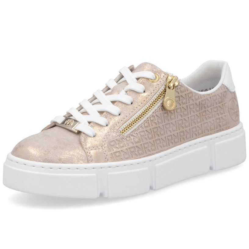 Diese einzigartigen RIEKER Sneaker kombinieren einen pastellrosa Farbton mit dezenten metallischen Akzenten und einem originellen Print, der ihnen Eleganz und Individualität verleiht. Durch die praktische Schnürung lassen sie sich perfekt an den Fuß anpassen, während der Reißverschluss auf dem Spann ein schnelles und bequemes Anziehen ermöglicht. Die Lederdecksohle sorgt für maximalen Komfort und Unterstützung den ganzen Tag über, während die flexible Sohle Stöße dämpft und für ein leichtes Laufgefühl sorgt. Dieses Modell ist die ideale Wahl für Frauen, die stilvolles und gleichzeitig bequemes Schuhwerk für den Alltag suchen.