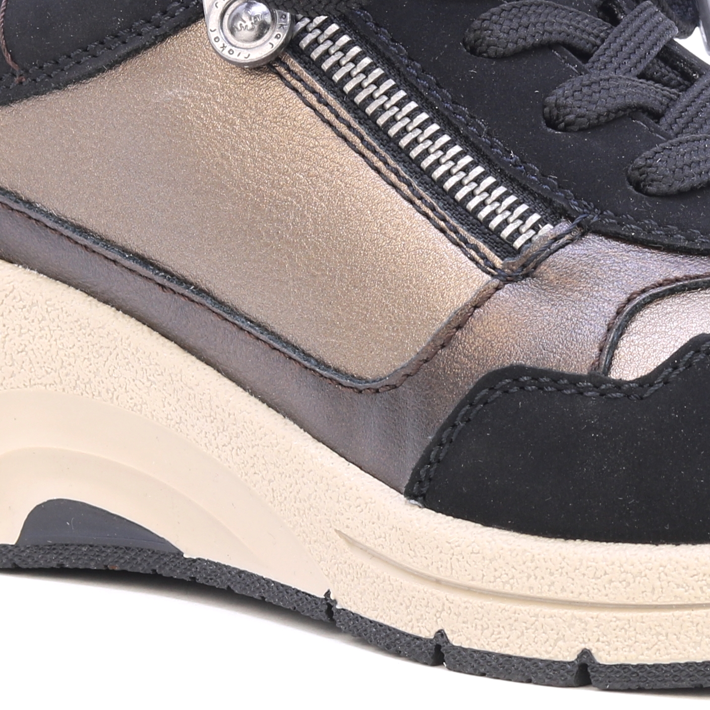 Das Design der Marke RIEKER zeichnet sich durch eine originelle Farb- und Materialkombination aus, die den Schuhen ein einzigartiges Aussehen verleiht. Das Fell am Spann verleiht den Schuhen ein einzigartiges Flair und ist ein interessantes Detail für Ihr Outfit. Die weiche, herausnehmbare Innensohle sorgt für ganztägigen Komfort und Halt, während die stilvolle Sohle nicht nur den modischen Eindruck verstärkt, sondern auch Stöße wirksam absorbiert, was den Gehkomfort verbessert und die Füße schützt. Die Kombination aus Schnürung und Reißverschluss ermöglicht ein einfaches Anziehen und Anpassen an Ihre Bedürfnisse. Aufgrund ihres Komforts und Stils sind diese Schuhe eine gute Wahl für den Alltag.
