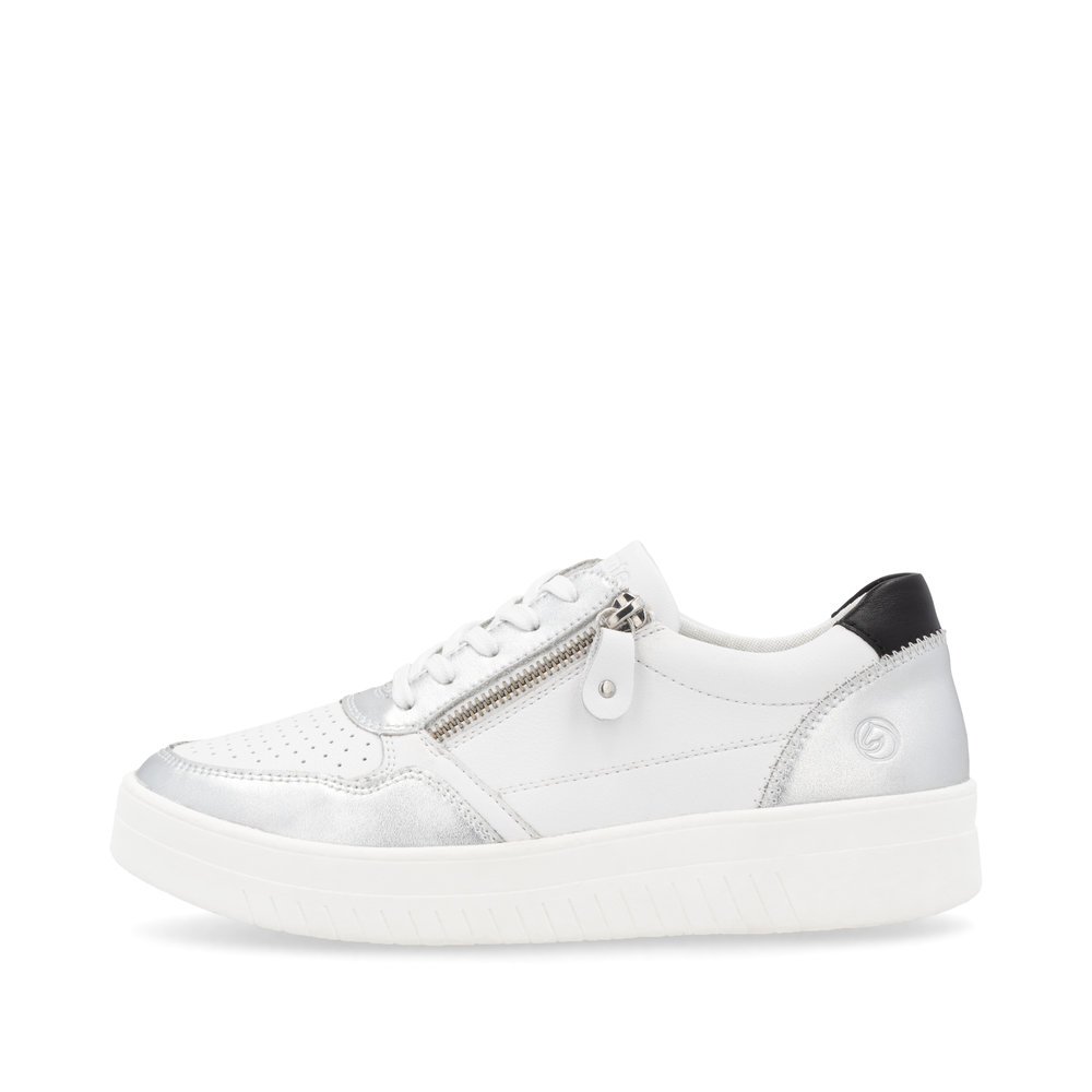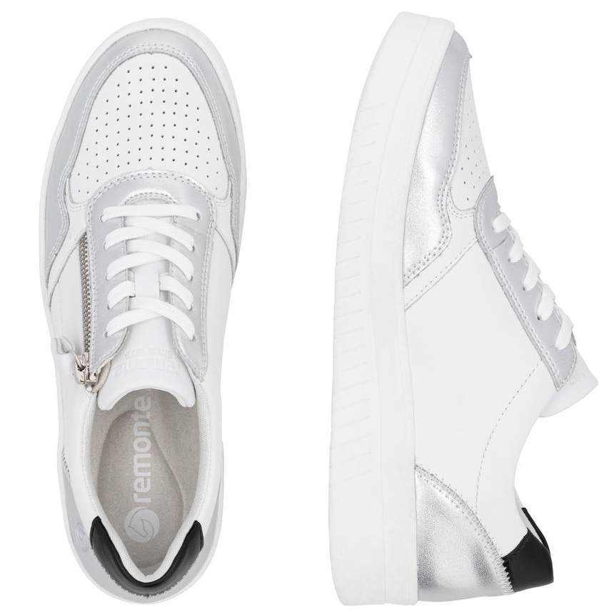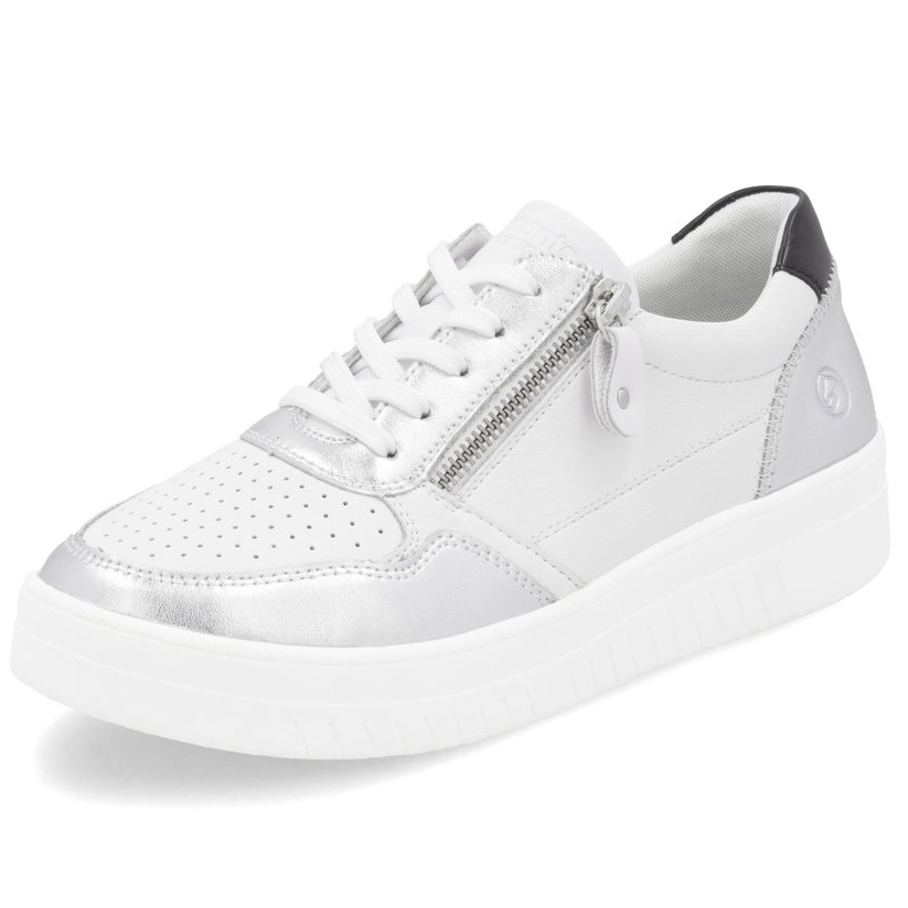 Das REMONTE-Schuhwerk ist die höherwertige Linie der Marke RIEKER und zeichnet sich durch die hohe Qualität der verwendeten Materialien aus. Die Damensneakers ziehen sofort die Aufmerksamkeit auf sich, da das weiße Obermaterial durch markante metallische Details perfekt ergänzt wird. Ein funktioneller Reißverschluss an der Außenseite erleichtert das Anziehen, und die Schnürung ermöglicht es, den Schuh ganz nach Ihren Wünschen anzupassen. Für maximalen Komfort bei jedem Schritt sorgt die weiche, herausnehmbare Einlegesohle, die den ganzen Tag über für Wohlbefinden sorgt. Dieses Modell lässt sich problemlos mit anderen Accessoires, wie zum Beispiel einem Rucksack aus unserem breiten Sortiment, kombinieren. Mit der Remonte Soft-Technologie, einer einzigartigen Einlegesohle aus atmungsaktivem Material, wird den ganzen Tag über ein angenehmes Tragegefühl gewährleistet. Die Lite'n Soft-Technologie sorgt für maximalen Komfort durch die leichte Sohle, sehr angenehme Materialien und eine komfortable Einlegesohle.