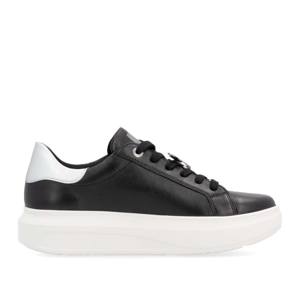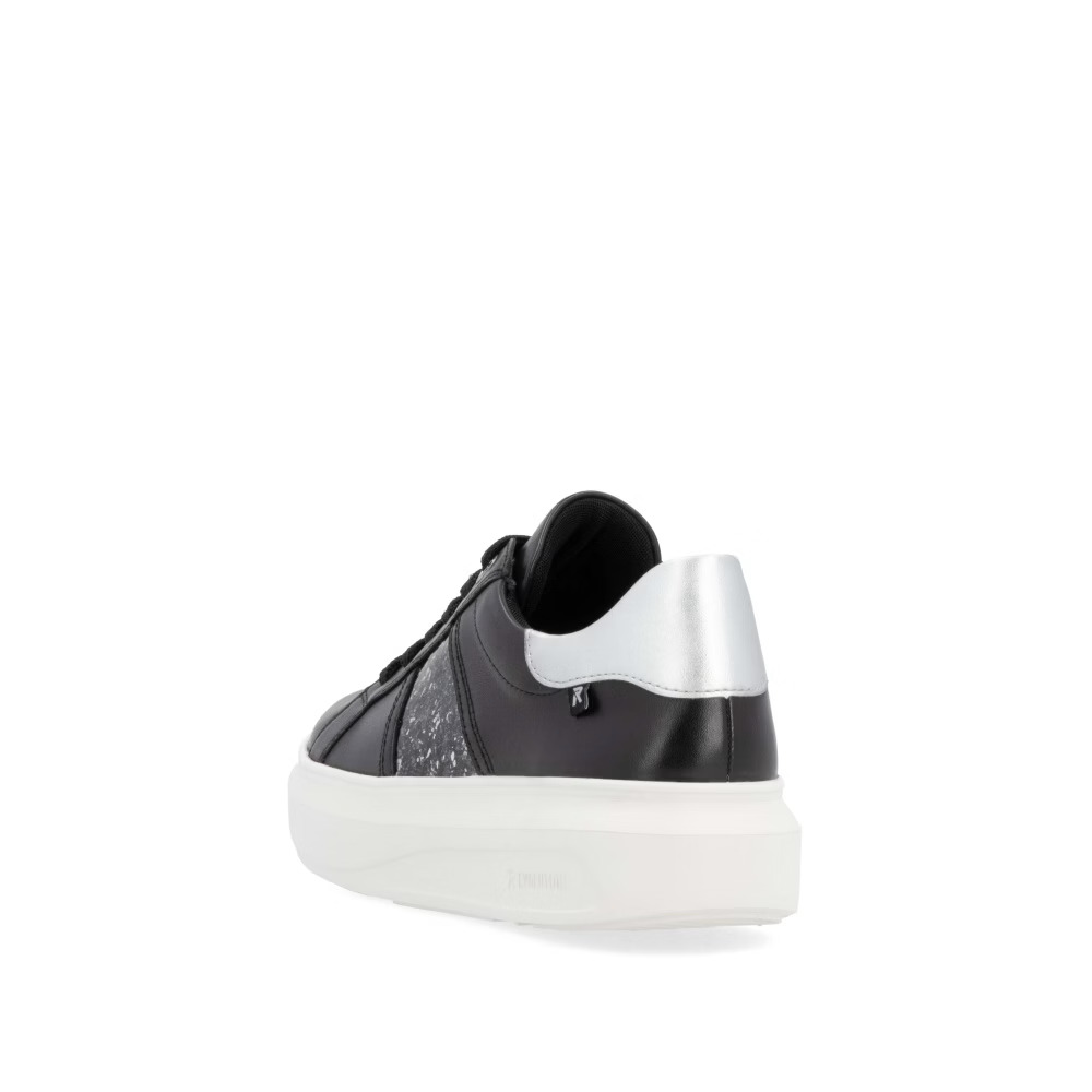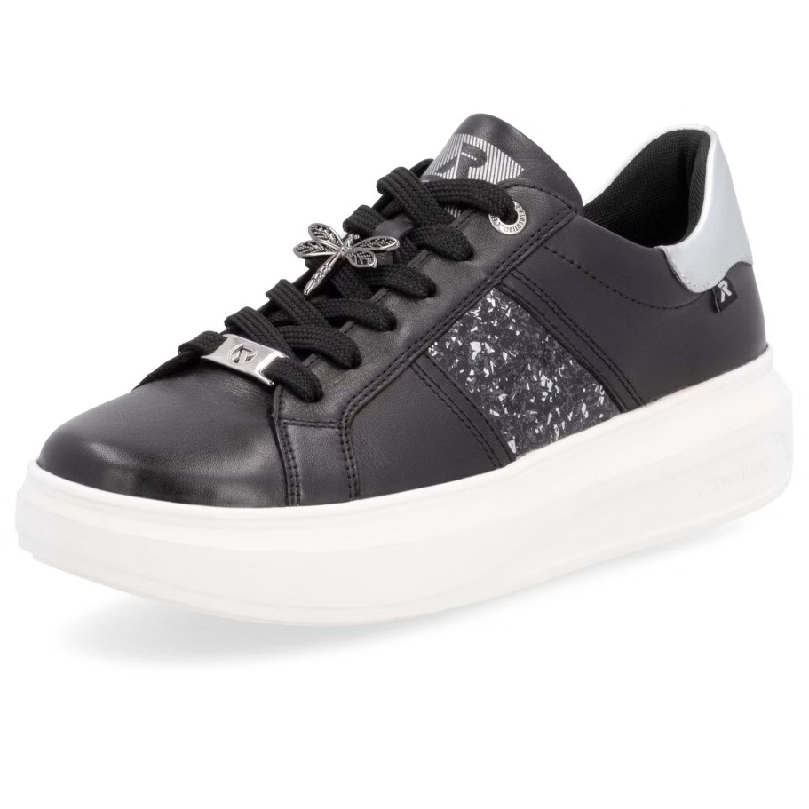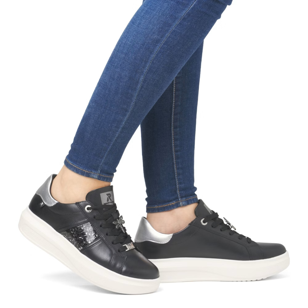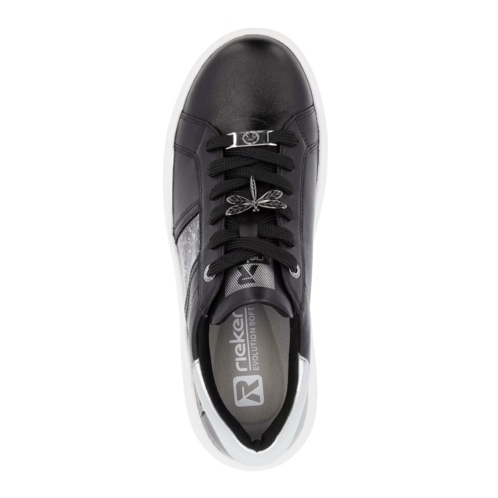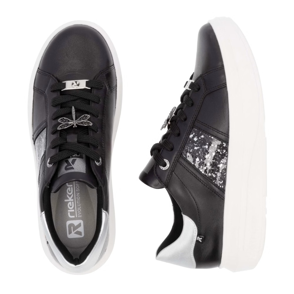 Rieker REVOLUTION präsentiert eine neue Linie moderner Sportschuhe, die besonderen Wert auf Komfort und Bequemlichkeit auch beim ganztägigen Tragen legt. Diese einzigartigen Sneaker heben jedes Outfit auf die nächste Stufe. Das Obermaterial aus schwarzem Leder besticht durch ein originelles Designelement an der Seite, einen metallischen Silberabsatz und eine dekorative Libelle an den Schnürsenkeln, sodass diese Schuhe nicht fehlen dürfen. Durch die Schnürung können Sie die Schuhe individuell an Ihre Bedürfnisse anpassen. Beim Gehen werden Sie die weiche, herausnehmbare Innensohle zu schätzen wissen, die bei jedem Schritt für Komfort sorgt. Wohin Sie auch gehen, diese Schuhe werden Ihr zuverlässiger und bequemer Begleiter sein. Technologie: RevolutionSoft: Eine einzigartige Einlegesohle, die den Fuß weich macht und sich perfekt an die Form Ihres Fußes anpasst. Herausnehmbare Innensohle: Für einfache Wartung und erhöhten Komfort.