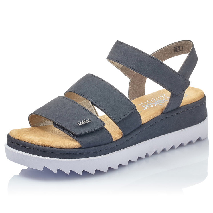 Die Damen-Sandalen von RIEKER vereinen stilvolles Design mit höchstem Tragekomfort und sind perfekt für den Alltag. Das dunkelblaue Velours-Obermaterial verleiht dem Schuh eine elegante Note, während das metallene Rieker-Logo auf der Vorderseite das Design abrundet. Drei vordere Klettverschlüsse ermöglichen eine individuelle Anpassung an den Fuß und sorgen für optimalen Halt und Komfort. Die weiße Kontrastsohle mit grobem Profil bietet nicht nur einen optischen Akzent, sondern absorbiert auch effektiv Stöße und sorgt für Stabilität auf verschiedenen Untergründen. Diese Sandalen sind eine hervorragende Wahl für die Arbeit oder entspannte Spaziergänge mit der Familie – leicht, flexibel und bequem für jeden Schritt.