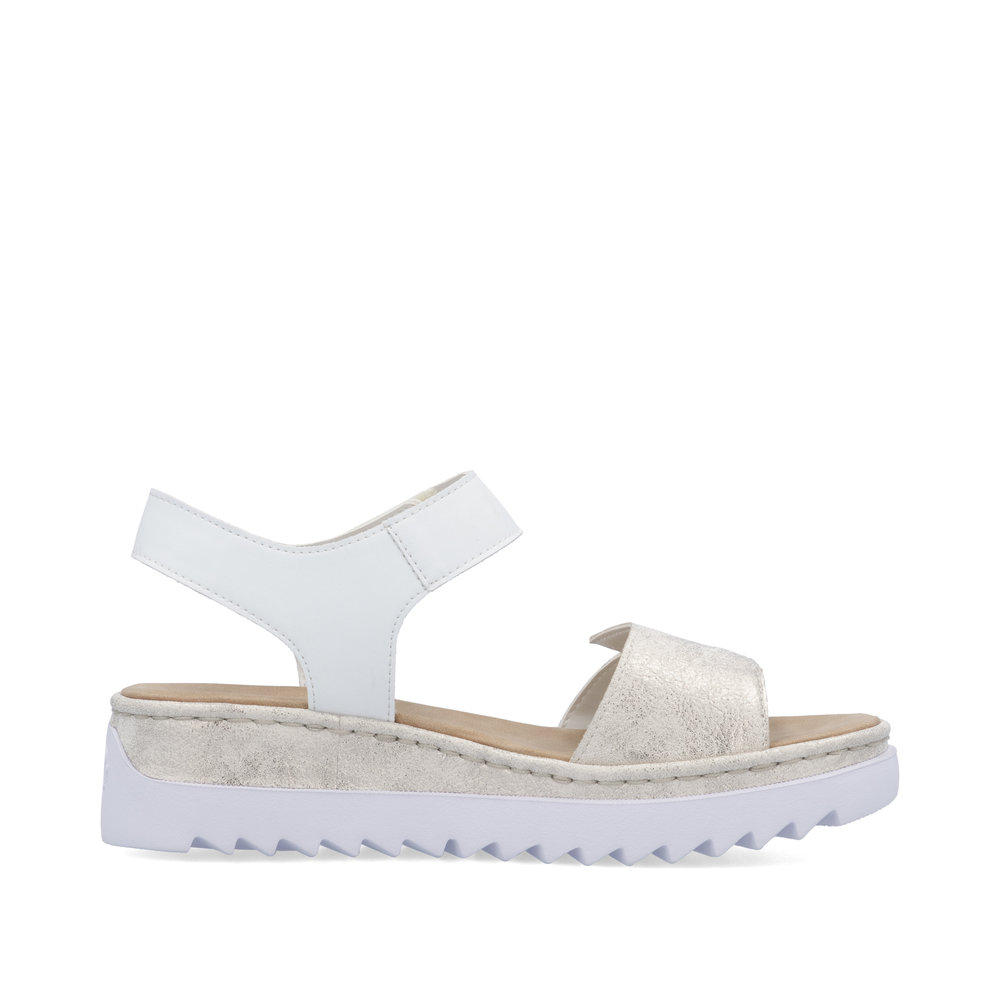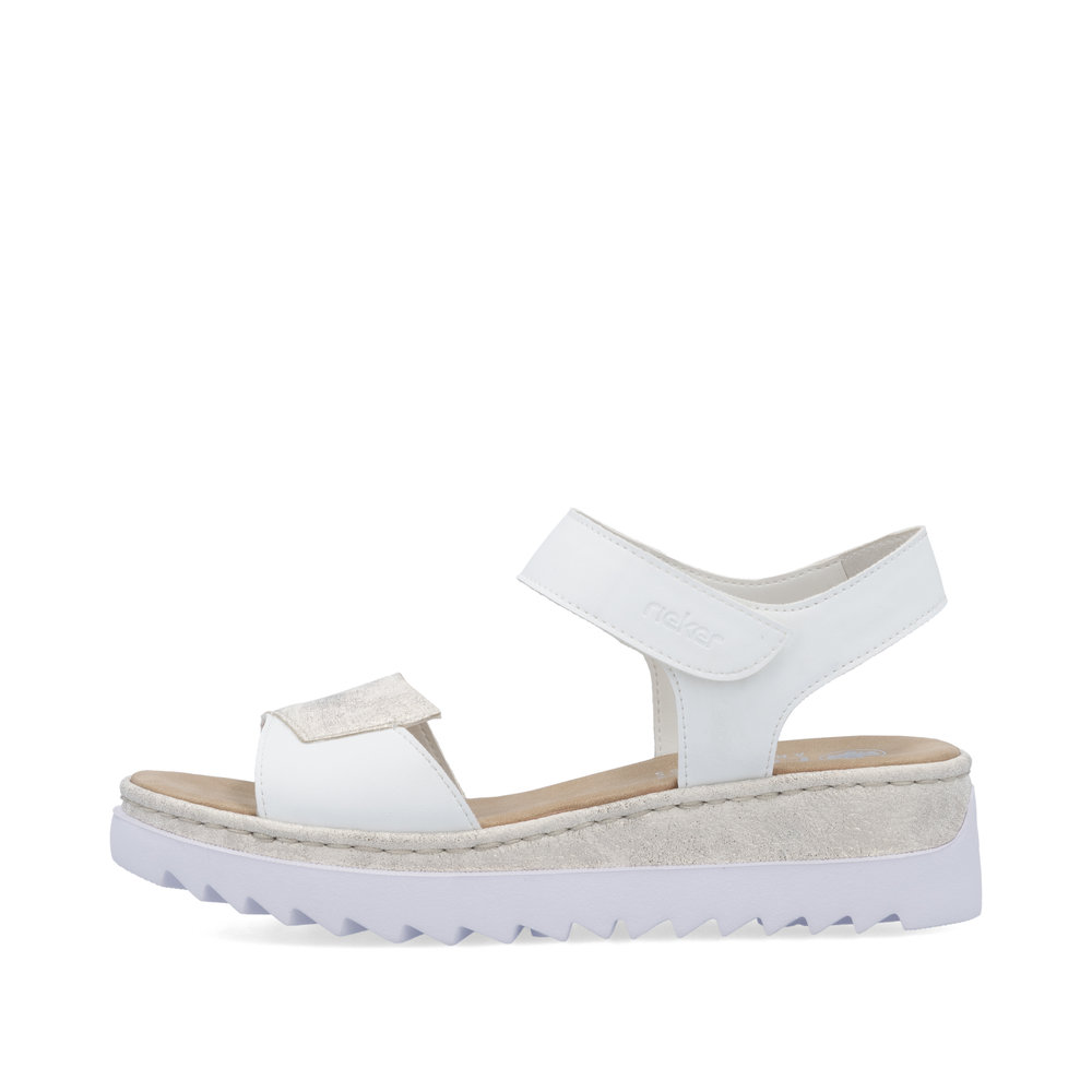 Die zauberhaften RIEKER Sandalen in Weiß begeistern mit einem stilvollen Detail am vorderen Riemen, das dem Schuh ein einzigartiges und modisches Aussehen verleiht. Der Knöchelriemen ist mit einem praktischen Klettverschluss ausgestattet, der ein schnelles An- und Ausziehen sowie eine optimale Anpassung an den Fuß ermöglicht. Die erhöhte Sohle bietet nicht nur einen modernen Look, sondern sorgt auch für hervorragende Stabilität und effektive Stoßdämpfung beim Gehen. Eine weiche Innensohle garantiert ganztägigen Tragekomfort – perfekt für ausgedehnte Spaziergänge oder einen aktiven Tag. Dank der RIEKER Antistress- und RIEKER Light-Technologien sind die Sandalen besonders leicht, flexibel, geräumig und stoßabsorbierend, was den Komfort auf ein neues Level hebt. Diese Sandalen sind die ideale Wahl für stilbewusste Frauen, die auf Komfort nicht verzichten wollen.