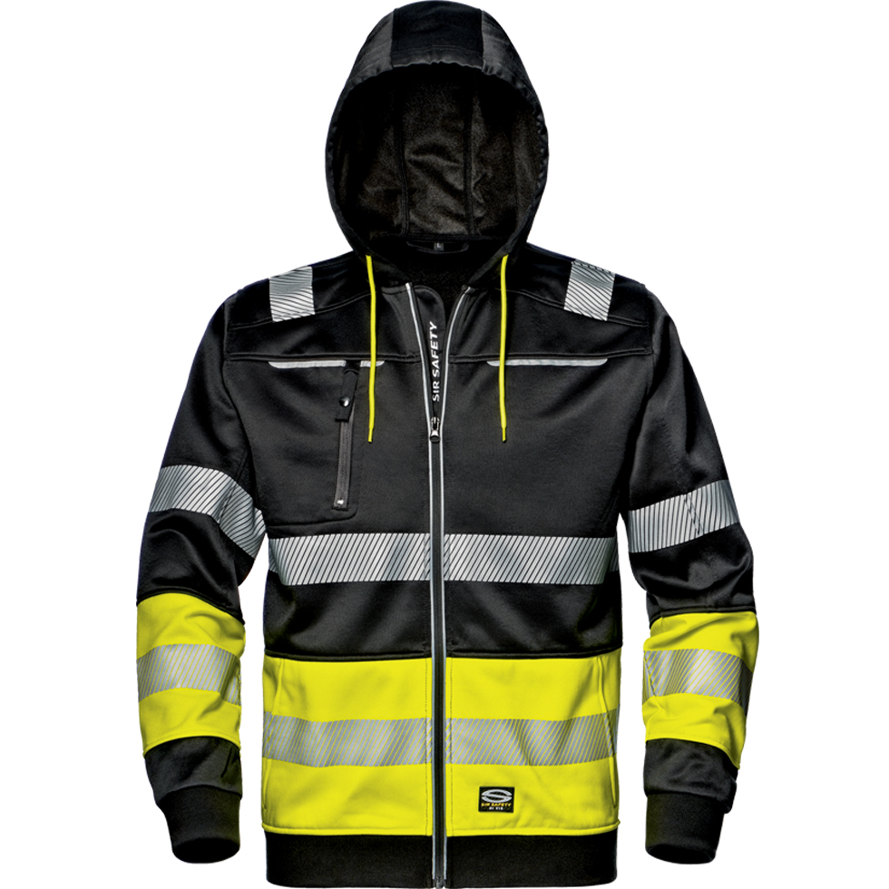 Sweatshirt aus 65 % Polyester und 35 % Baumwolle mit einem Gewicht von 300 g/m2. Es verfügt über einen Reißverschluss vorne, eine durch Kordelzug verstellbare Kapuze, eine kleine Tasche auf der rechten Brustseite mit Reißverschluss und Seitentaschen. Es ist mit heißversiegelten, segmentierten Reflexstreifen an den Schultern, im Brustbereich, an der Taille und an den Ärmeln ausgestattet. Die Bündchen und der Saum bestehen aus einem gerippten Strickstoff, der zu 55 % aus Baumwolle und zu 45 % aus Polyester besteht. Das Produkt wurde gemäß der Verordnung (EU) 2016/425 entwickelt und hergestellt. Das Sweatshirt ist auch für den täglichen Gebrauch bei schlechten Sichtverhältnissen geeignet.