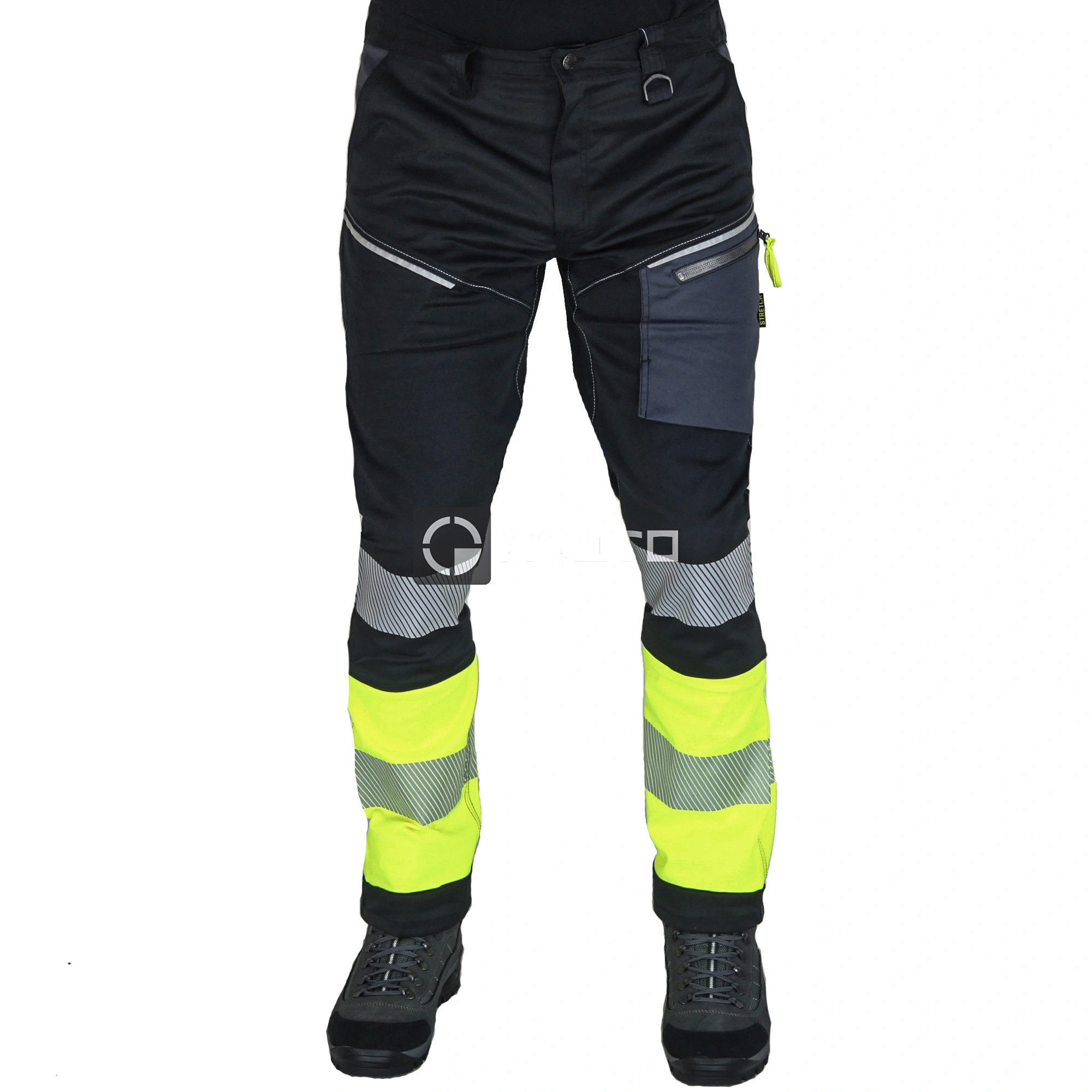 Hose aus Twill-Stretchstoff, bestehend aus 77 % Polyester, 20 % Baumwolle und 3 % Elasthan, mit einem Gewicht von 245 g/m2. Sie verfügen über einen zentralen Druckknopf- und Reißverschluss sowie verstärkte Gürtelschlaufen, wobei eine auf der linken Seite einen D-Ring enthält. Die Hose hat zwei Seitentaschen und eine Hängetasche am linken Bein in grauer Farbe, die mit einem Reißverschluss verschlossen werden kann. Sie enthalten reflektierende Elemente für bessere Sichtbarkeit und sind im unteren Teil in einer markanten gelben Farbe gehalten. Sie sind mit zwei heißversiegelten segmentierten Reflexstreifen um die Beine ausgestattet. Das Produkt wurde gemäß der Verordnung (EU) 2016/425 und ihren nachfolgenden Änderungen entwickelt und hergestellt. Entspricht EN ISO 20471 Klasse 1: enthält 0,14 m2 fluoreszierendes Material und 0,10 m2 retroreflektierendes Material.