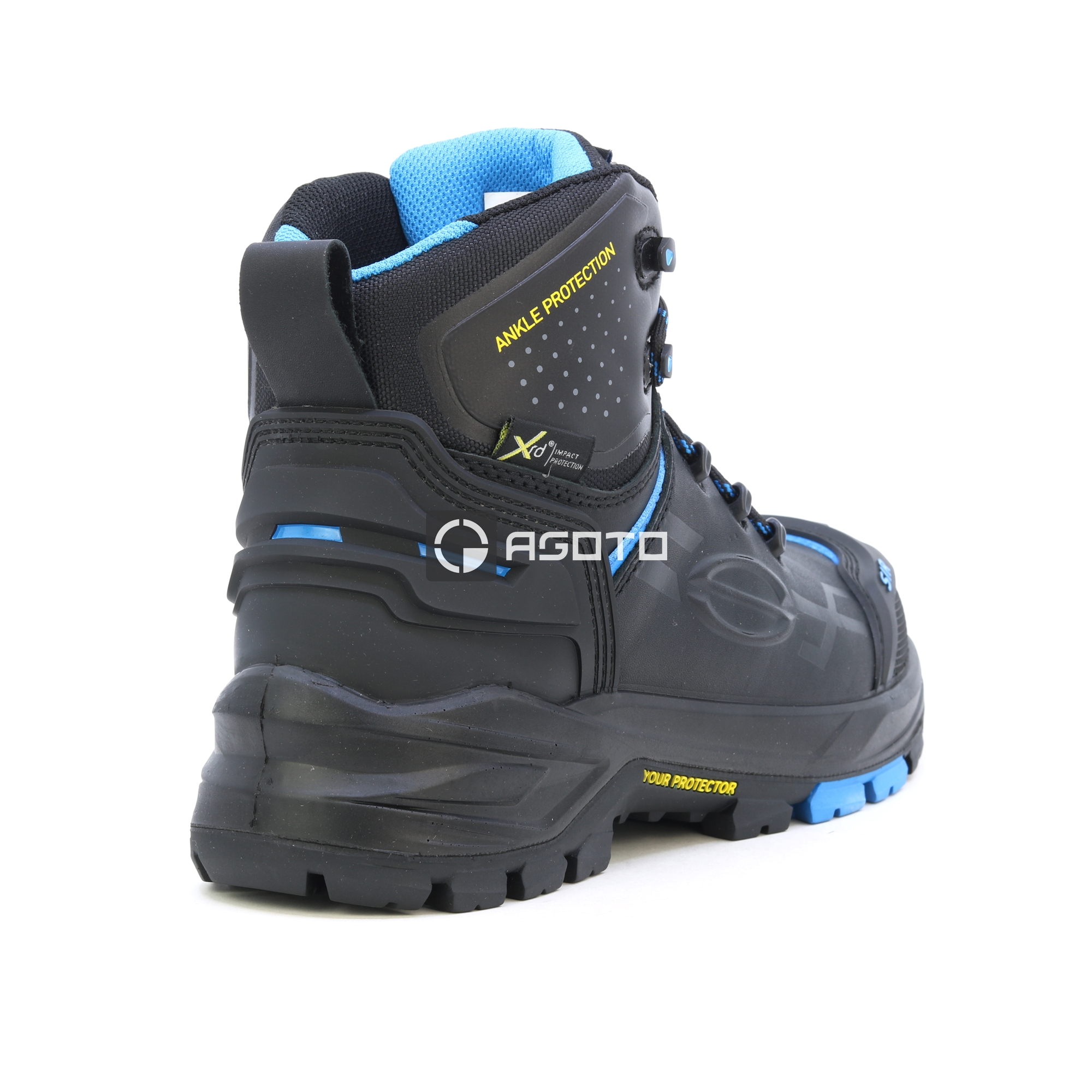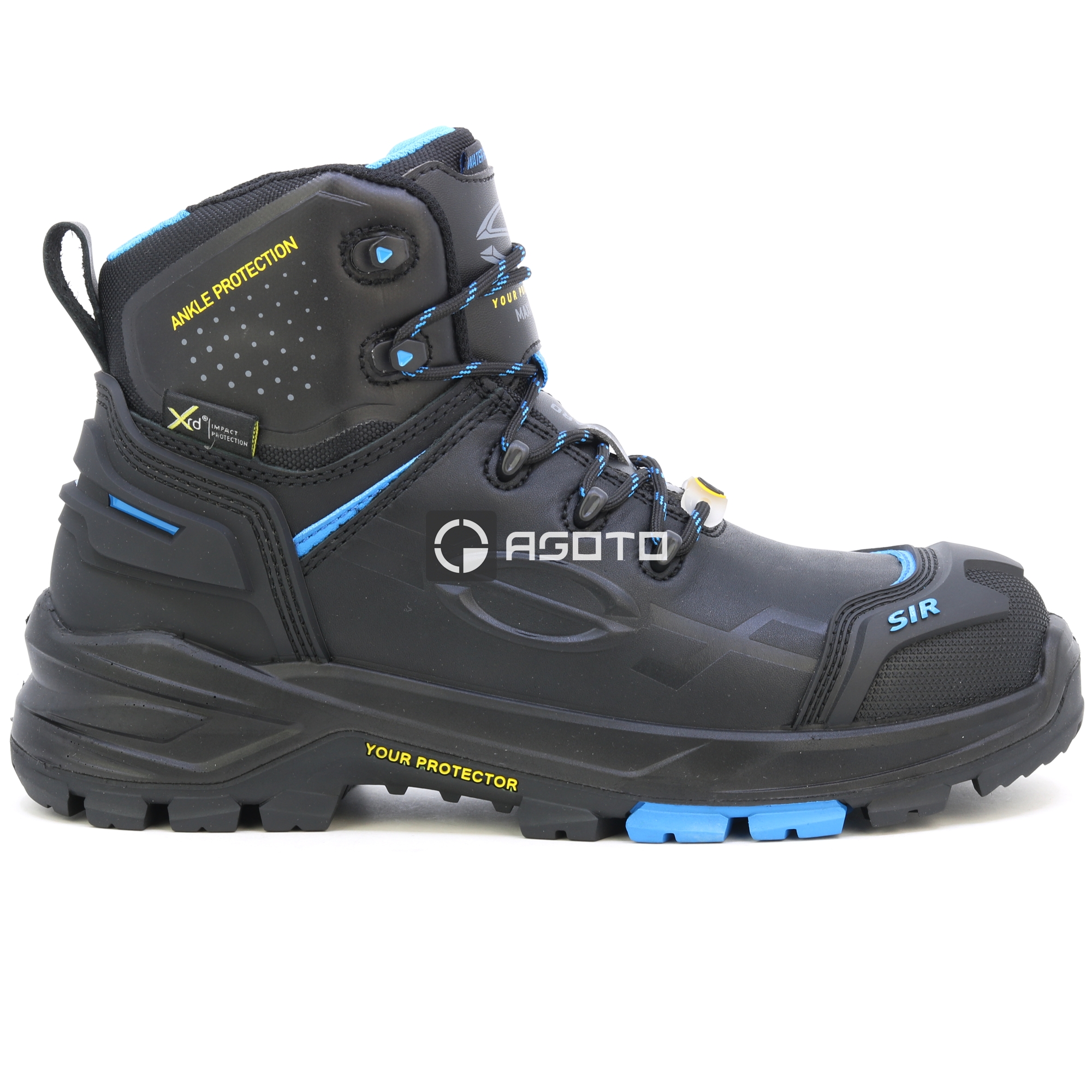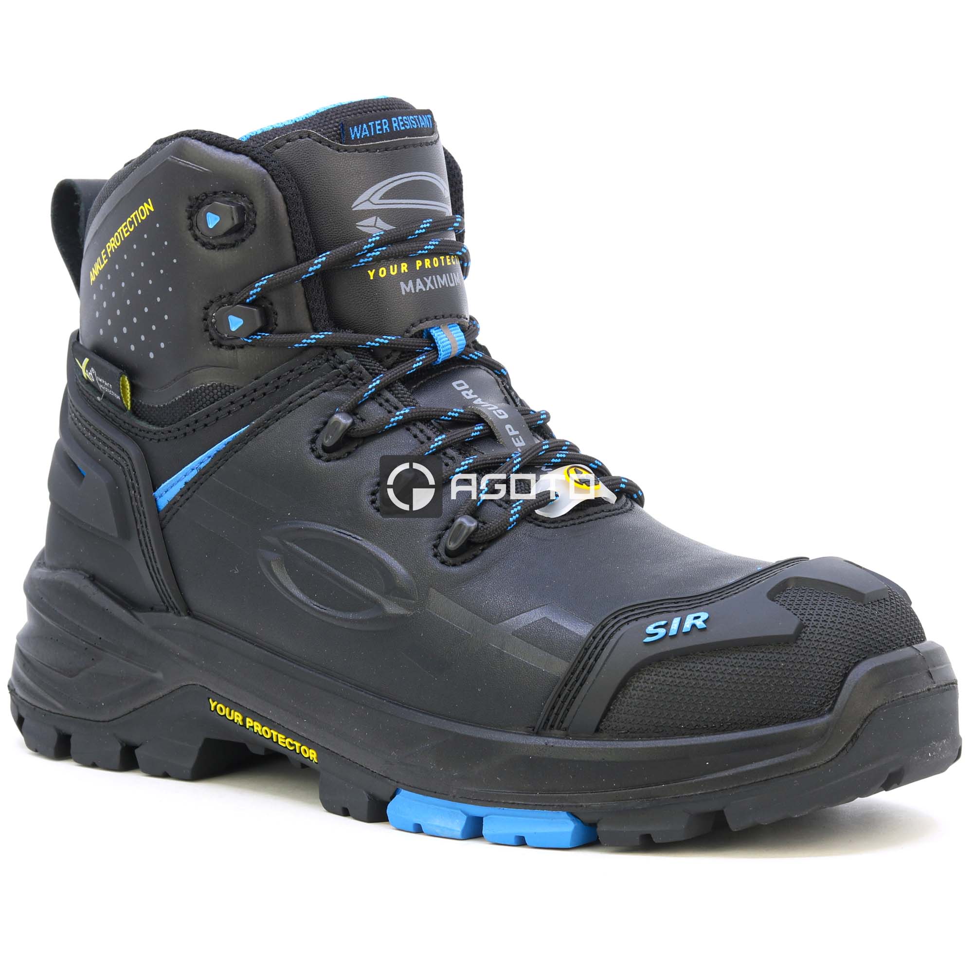 Hohe, geschnürte Sicherheitsschuhe aus hochwertigem Vollleder mit einer PS-Komposit-Zwischensohle und einer Zehenschutzkappe aus Fiberglas für maximalen Schutz. Die zweikomponentige Sohle aus Polyurethan und Nitrilgummi bietet eine hervorragende Stoßdämpfung und hohe Abriebfestigkeit. Das hitzebeständige Nitrilgummi-Profil sorgt für starken Halt auf nassen Oberflächen, während der mittlere Bereich abriebfest ist und mit speziellen Profilstollen für besseren Halt auf Leitern ausgestattet ist. Die Memory-PU-Einlegesohle mit hochdichtem Polyurethanschaum und variabler Dicke sorgt für optimale Dämpfung und absorbiert Stöße, was den Tragekomfort bei längerem Einsatz erheblich verbessert. Antistatisch, mit DRY PLUS-Polyesterfutter, das Feuchtigkeit effizient ableitet und eine Überhitzung der Füße verhindert. Die WR-Innensocke sorgt für zusätzlichen Schutz vor Feuchtigkeit. Verstärkte Schnürsenkel, eine abriebfeste TPU-Überkappe, eine verstärkte Fersenkappe, tiefe Rillen für eine effiziente Flüssigkeitsableitung und scharfkantige Profilstollen für bessere Selbstreinigung und mehr Grip sorgen für maximale Strapazierfähigkeit. Das Ladder Grip System (LG) gewährleistet erhöhte Sicherheit bei Arbeiten auf Leitern. Die Nitrilgummi-Sohle ist hitzebeständig, säurebeständig, ölresistent, abriebfest und durchtrittsicher. Perfekt für anspruchsvolle Umgebungen wie kiesige, felsige oder unebene Böden. Entspricht den Normen EN ISO 20345 und der Sicherheitsklasse S7S AN CI HI HRO FO SC LG SR.