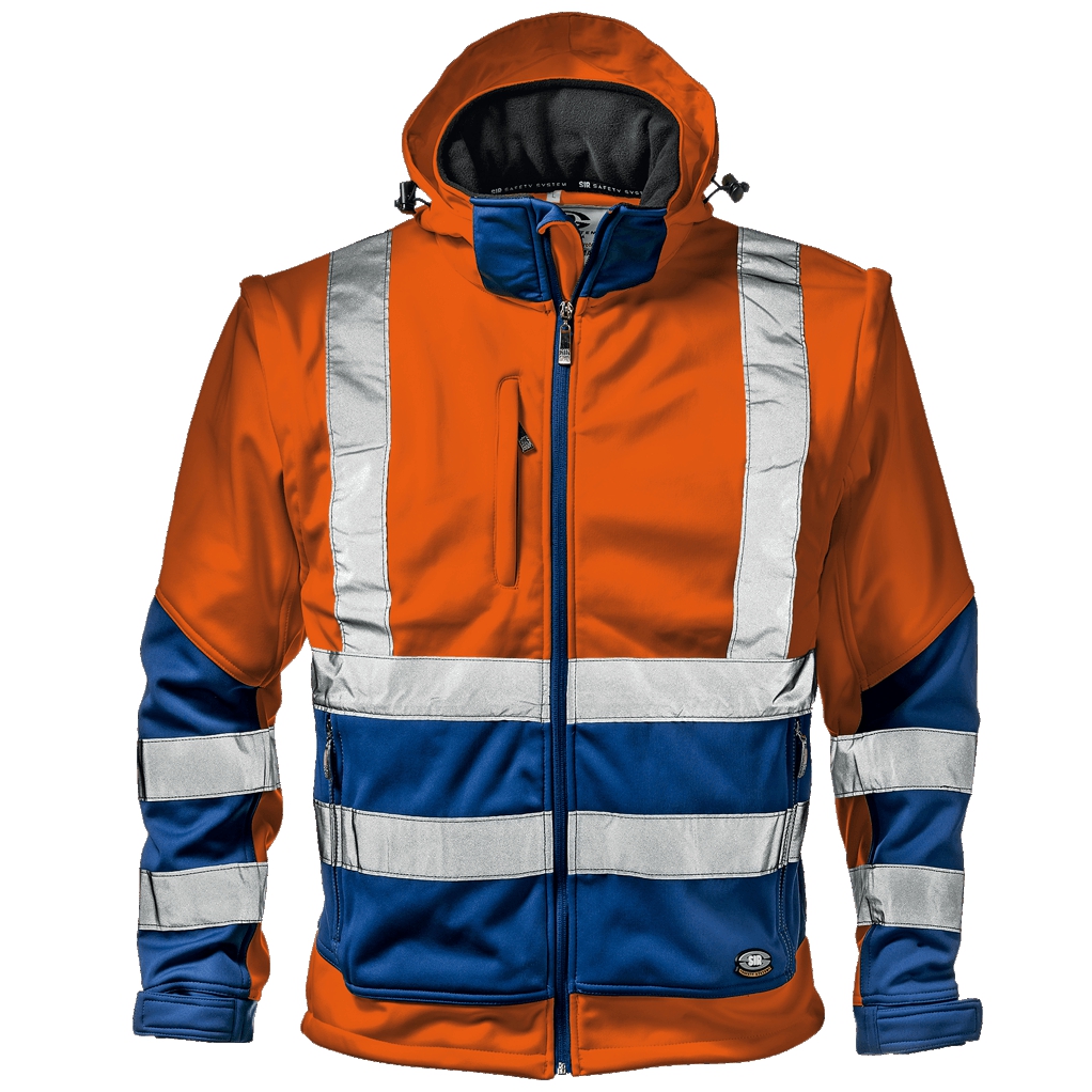 Vysoce viditelná bunda Softshell, vnitřní vrstva z mikrovlákna fleece. Centrální zapínání na zip, spodní část bundy nastavitelná se stahovací šňůrkou a odnímatelnou kapucí se zipem a stahovací šňůrkou; odnímatelné rukávy se zipem, manžety nastavitelné suchým zipem, dvě kapsy na rukávech se zipem a kapsy na hrudi se zipem. EN ISO 20471 třída:2