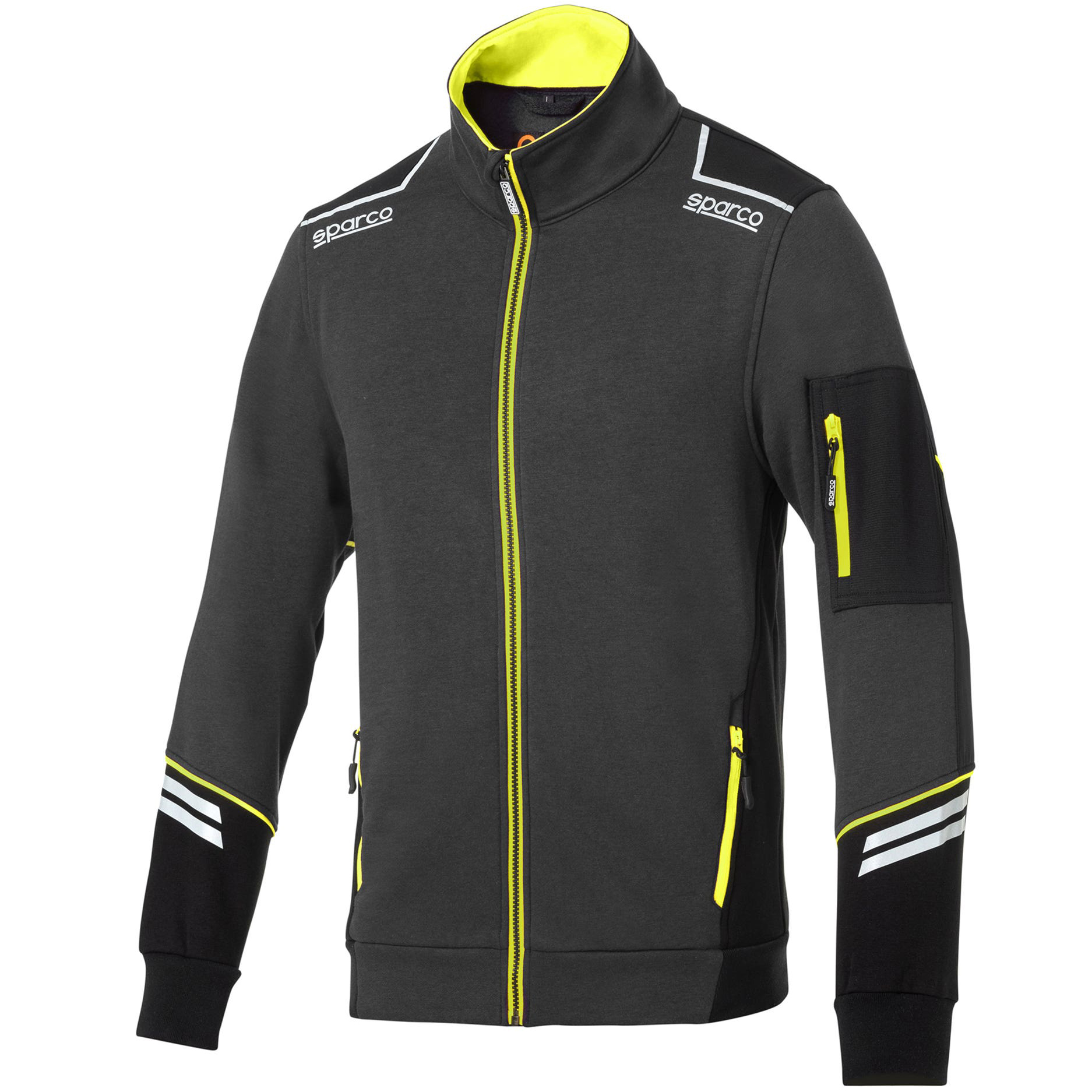 80 % Baumwolle – 20 % Polyester / 280 g/m2 reflektierende Sparco-Logos, verstärkte Ärmel mit Anti-Scheuer-Einsätzen und gut sichtbare reflektierende Streifen. Verstärkungseinsätze an den Schultern, seitlicher Ultra-Schiebereißverschluss an der Brusttasche.