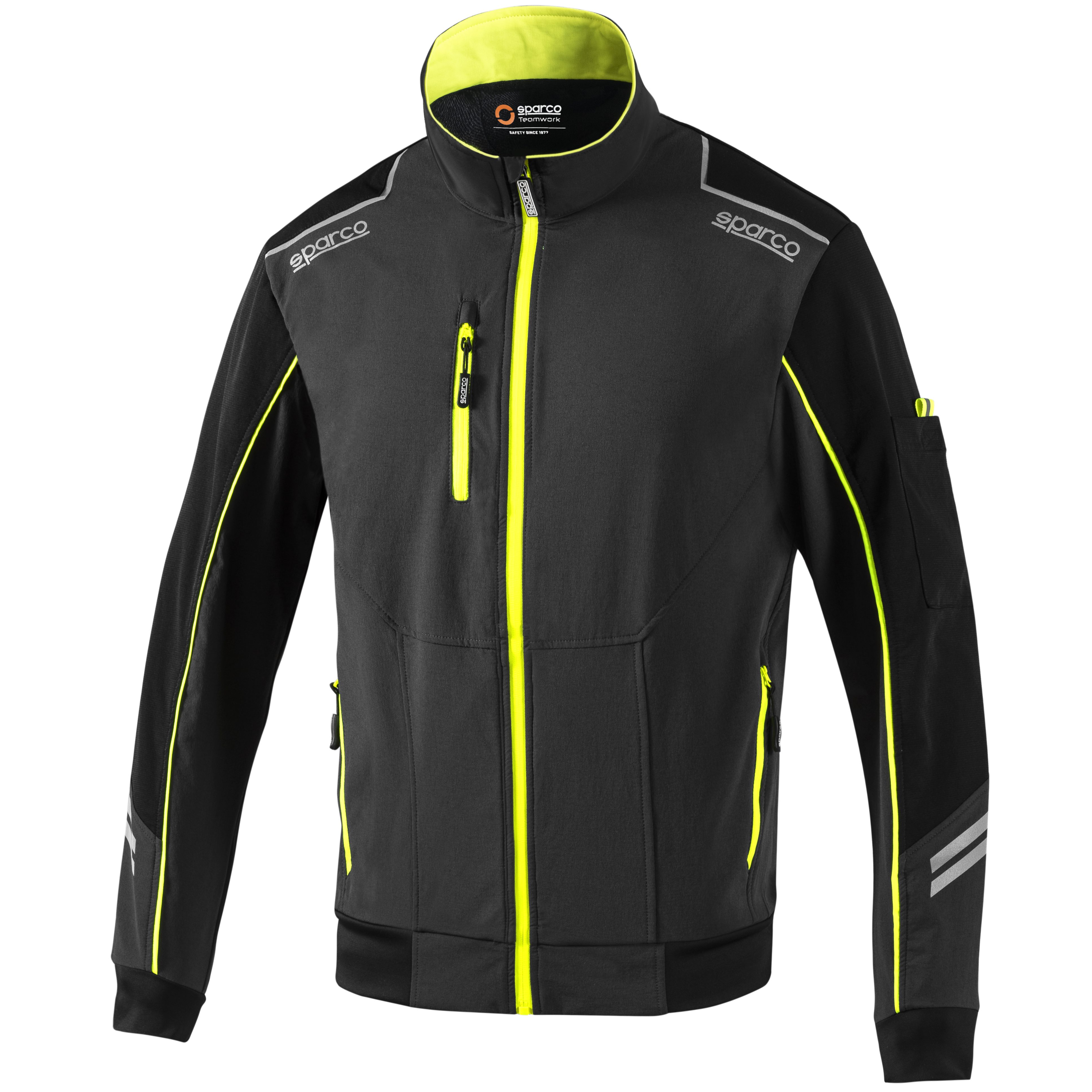 Leichte Softshell-Jacke von Sparco, die wind- und wasserdicht ist. Sie ist mit einem Fleece-Innenfutter ausgestattet. Material: 90 % Nylon - 10 % Spandex / 240 g/m2 Innen: 100 % Polyester (Polarfleece) Reflektierende Sparco-Logos, verstärkte Schulterpolster, Schultern und Ärmel aus abriebfestem Material. Beschichtete wasserdichte Reißverschlüsse, Seiten- und Brusttaschen mit gut sichtbaren Reißverschlüssen, Reflexstreifen an den Ärmeln, Superstretch-Stoff an den Bündchen, verstellbares Innenfutter für maximale Passform.