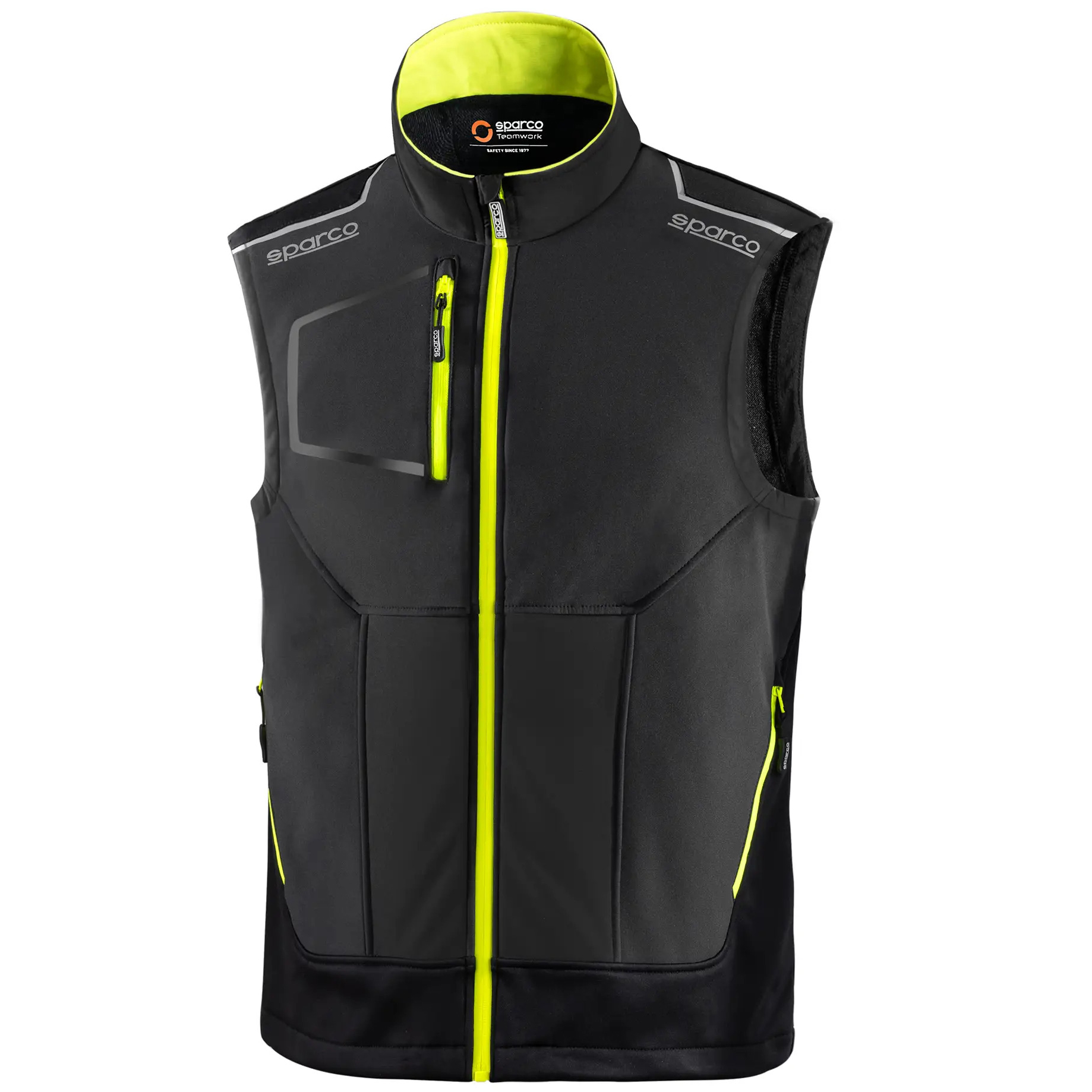 Eine wind- und wasserdichte Sparco-Softshellweste. Es ist mit einem Fleece-Innenfutter ausgestattet. Material: 90 % Nylon – 10 % Spandex / 240 g/m2. Innen: 100 % Polyester (Polarfleece), reflektierende Sparco-Logos, verstärkte Schulterpolster aus abriebfestem Material. Beschichtete wasserdichte Reißverschlüsse, Seiten- und Brusttaschen mit gut sichtbaren Reißverschlüssen, verstellbares Innenfutter für maximale Passform.