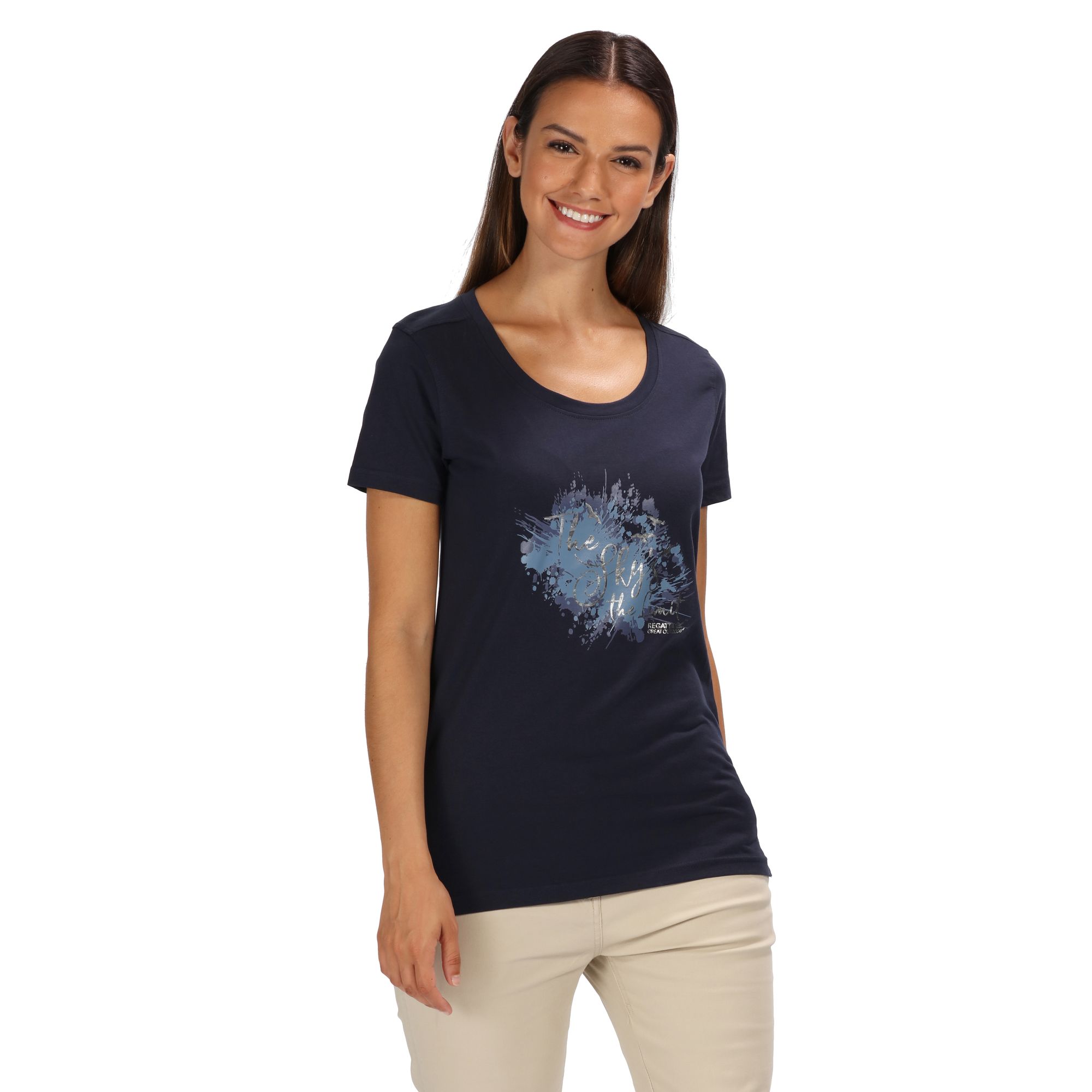Dámské tričko s krátkým rukávem Regatta Filandra III. Technologie Coolweave s chladícím účinkem. Bavlněná vlákna mají zcela přirozený chladicí účinek přímo na kůži. Potisk na přední straně. Materiál: 100% bavlna.